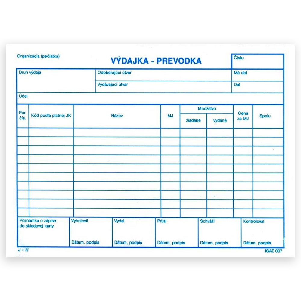 Tlačivo sa používa na výdaj - prevod tovaru bez DPH napr. v skladoch. Obsahuje 100 listový blok A5 formátu. Sfarbenie papiera biely, modré linky. Rozmery: 21 x 15 cm - samoprepis.