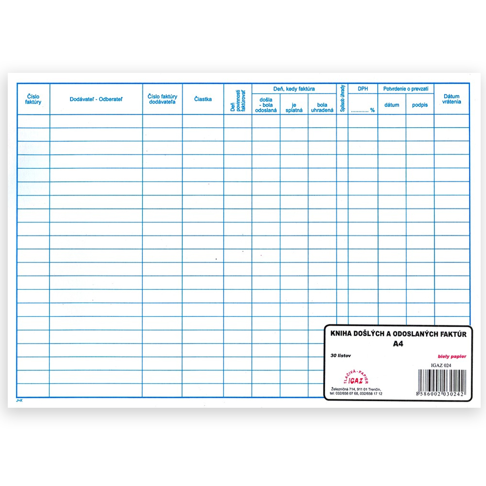 Kniha sa používa na evidenciu došlých a odoslaných faktúr. Obsahuje 30 listový blok formátu A4. Sfarbenie papiera biely, červené linky.