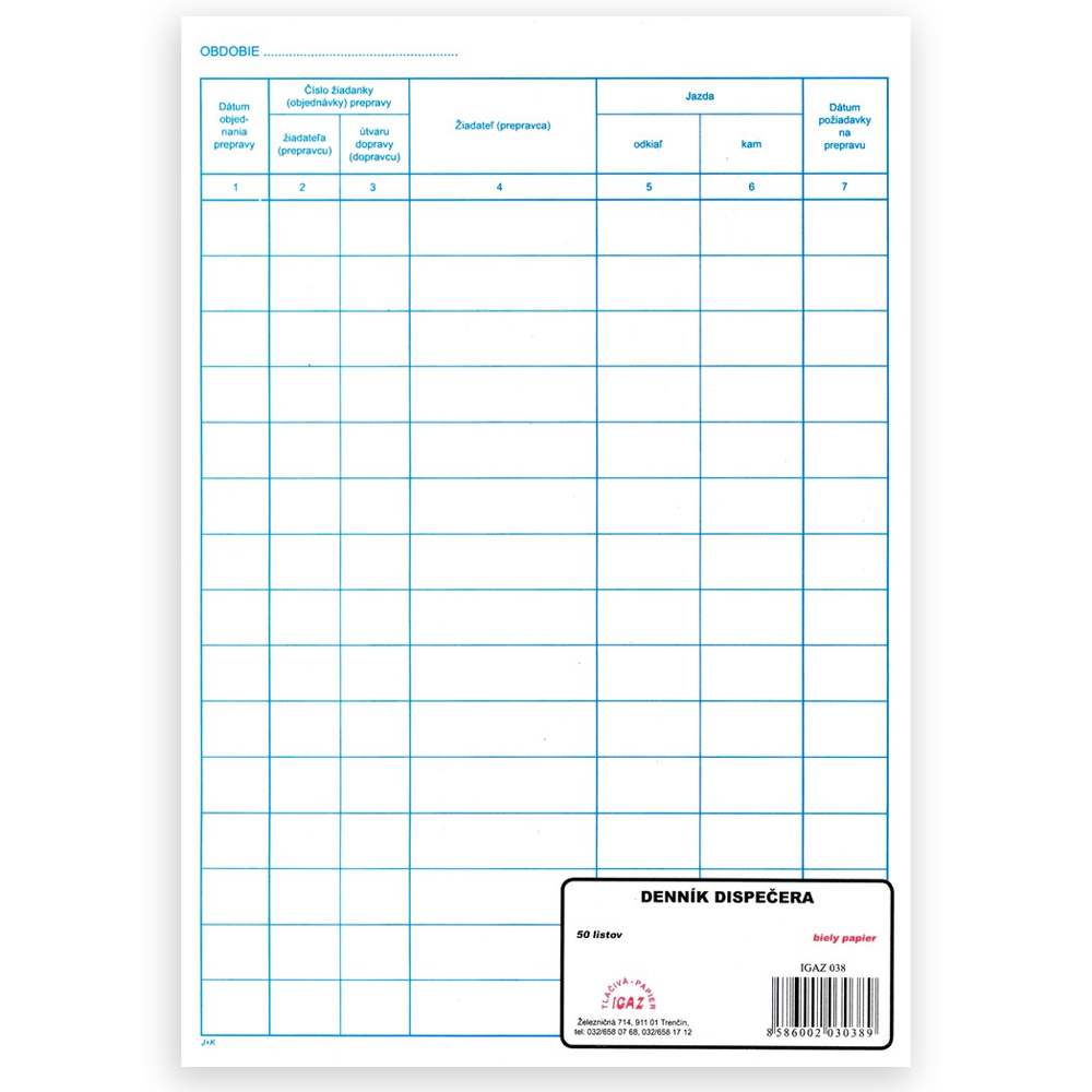 Denník sa používa na evidenciu dispečera v doprave. Obsahuje 50 listový blok formátu A4. Sfarbenie papiera biely, modré linky. Rozmery: 21 x 30 cm.