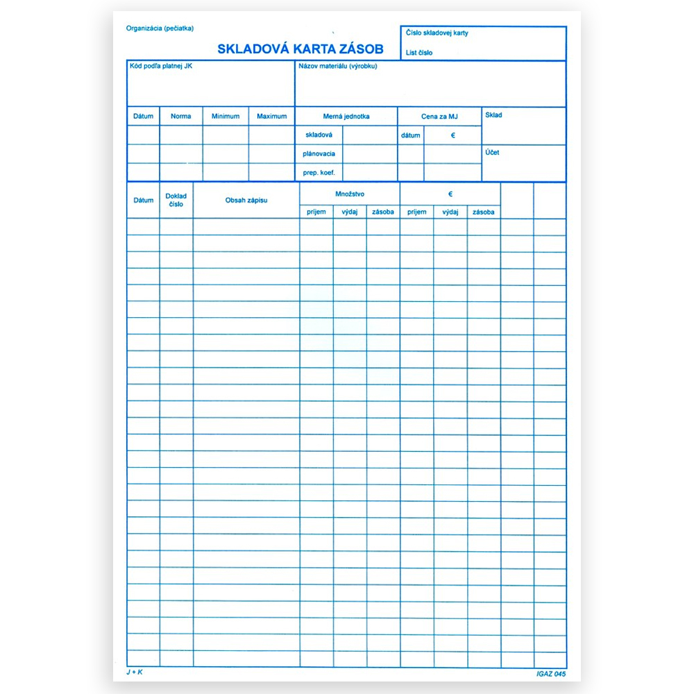 Karta sa používa na evidenciu príjmu, výdaju, stav tovaru v skladoch. Karta je zhotovená z kartónu. A4 formát. Sfarbenie biely, modré čiary.