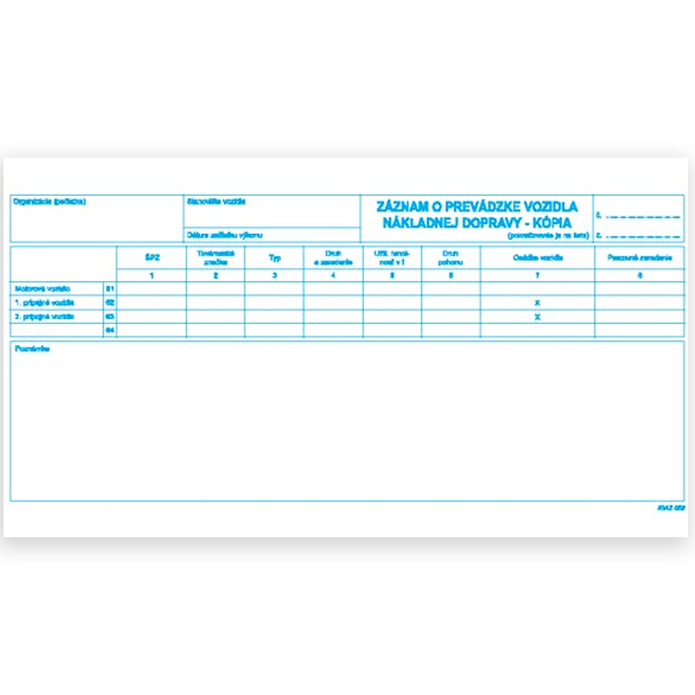 Tlačivo sa používa v doprave ako záznam o prevádzke vozidla nákladnej dopravy. Obsahuje 100 listový blok 2/3 A4 formátu+kópia. Sfarbenie papiera biely, modré linky. Rozmery: 14 x 29,5 cm.