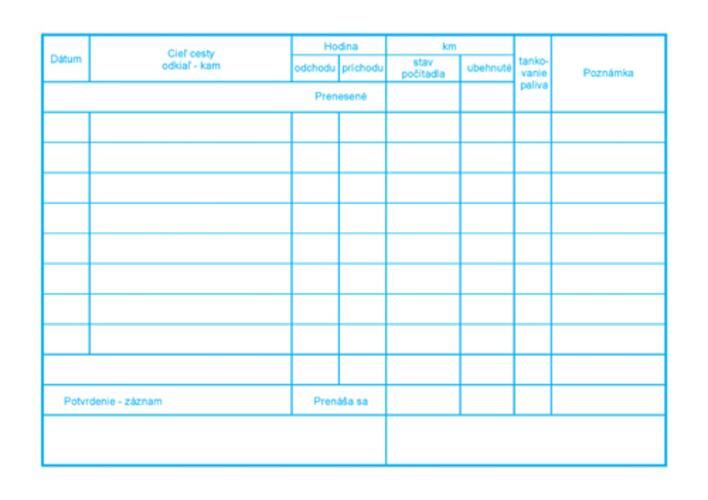 Tlačivo sa používa v doprave na evidenciu o prevádzke motorového vozidla osobnej dopravy. Obsahuje 60 listový blok A5 formátu. Sfarbenie papiera biely, čierne linky. Rozmery: 21 x 15 cm.