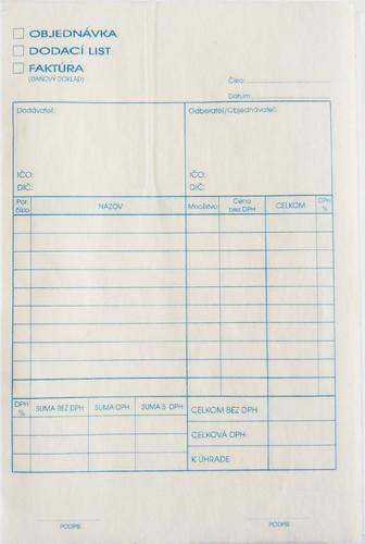 Tlačivo je možné použiť ako objednávku, dodací list, faktúru a zároveň slúži ako daňovy doklad. Obsahuje 100 listov, formát A5 blok s perforáciou. Rozmery: 21 x 15 cm.