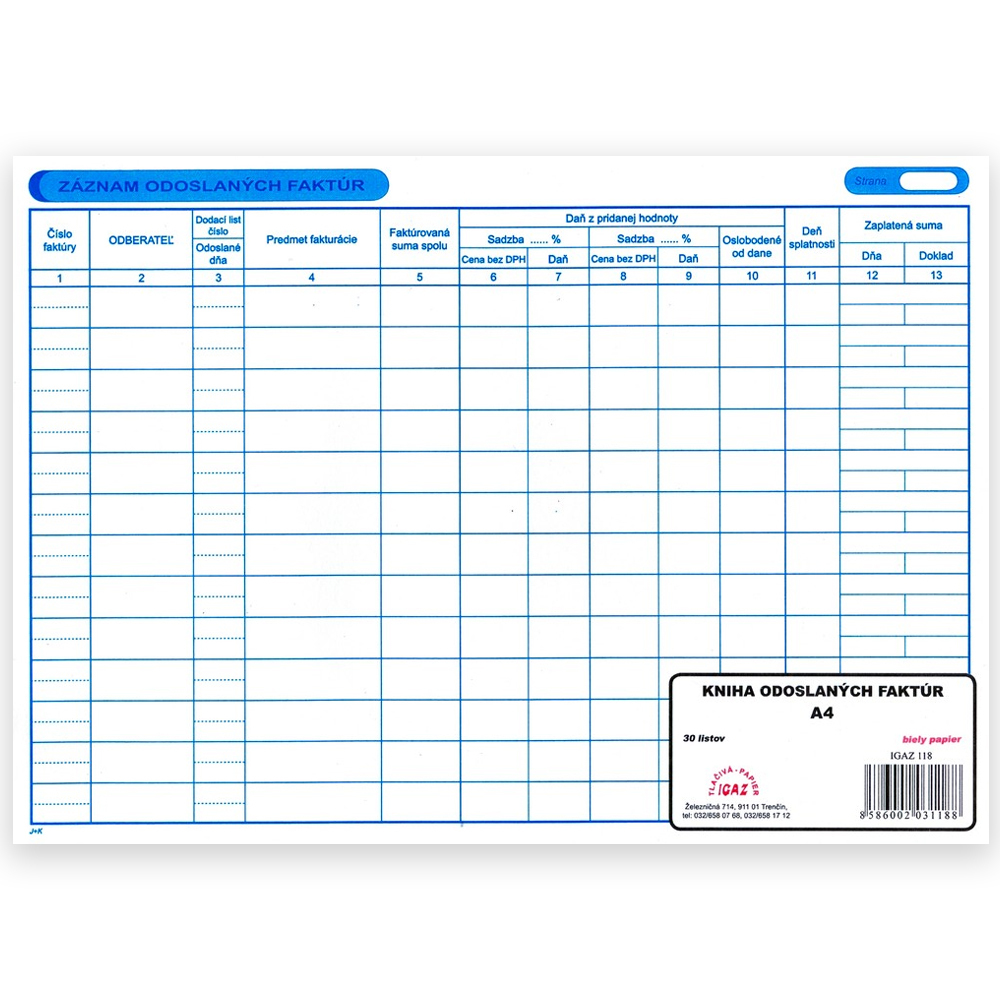 Zošit sa používa na evidenciu odoslaných faktúr. Sfarbenie papiera biely, modré linky. Obsahuje 30 listov A4 formátu. Rozmery: 21 x 31 cm.