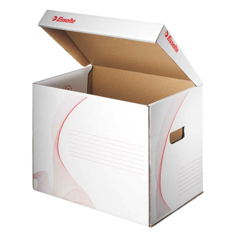 Ideálne na archiváciu dokumentov prenesených zo zakladačov šírky 75 a 80 mm. Široké otváranie umožňuje jednoduchší prístup k obsahu škatule a ich vkladanie je oveľa jednoduchšie. Jednoduchá skladanie, zrozumiteľné pokyny vytlačené na škatuli. Ideálna veľkosť na archiváciu v regáloch, Box je možné umiestniť vertikálne alebo horizontálne. Rozmery 330x80x260mm. Vysokú kvalitu boxov Esselte Standard oceňujú naši zákazníci viac ako 25 rokov. Tony dokumentov sú každoročne zabalené do škatúľ Esselte Standard na pracoviskách vo všetkých sektoroch.