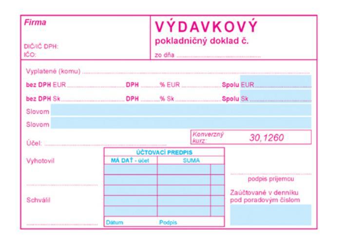 Tlačivo sa používa na výdaj peňažnej hotovosti. Blok formátu A6 obsahuje 100 listov modročervenej farby. Doklad s DPH neprepisový.