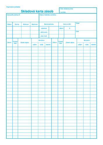 Karta sa používa na evidenciu príjmu, výdaju, stavu tovaru v skladoch. arta je zhotovená z kartónu. A4 formát. Sfarbenie kartón biely, modré čiary.
