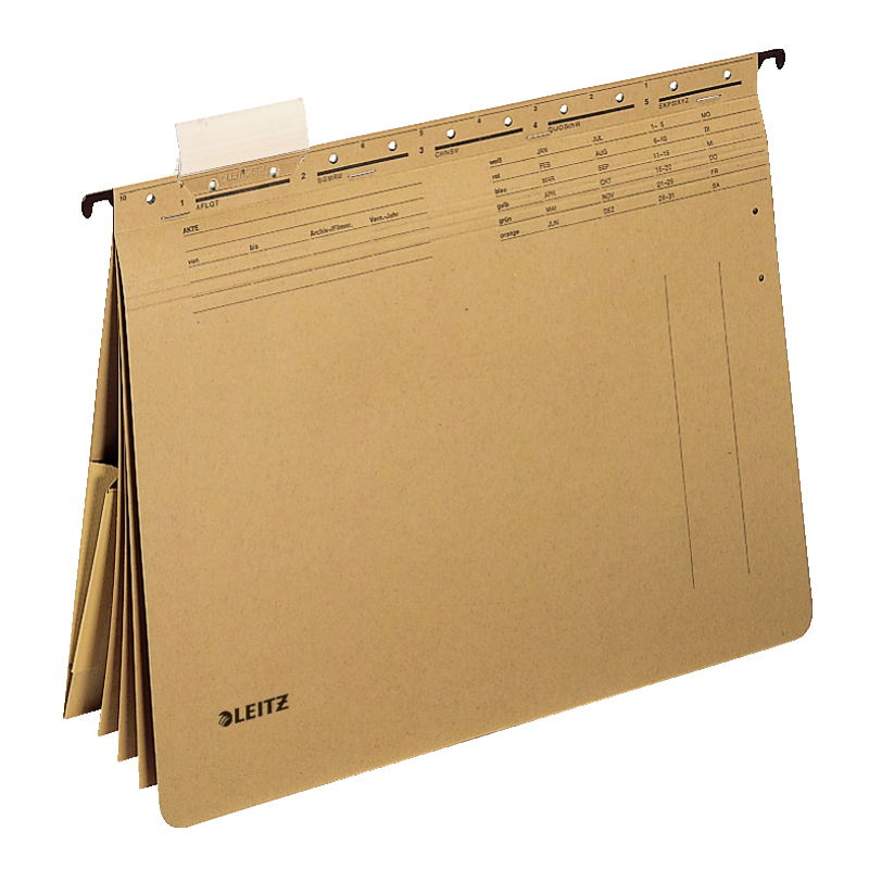 Vysoko kvalitný závesný obal vo farbe natúr, po stranách uzavreté s bočnicami. Obal je vybavený zo silnými a odolnými závesnými lištami a s veľkou nosnosťou. Bočnice chránia voľné dokumenty pred vypadnutím z dosiek. Výrezy na závesnej lište pre dodatočné upevnenie rýchloviazacej spony (nie je súčasťou balenia). Súčasťou závesného obalu je aj rozlišovač s vymeniteľným štítkom pre popis obsahu. Vyrobené zo 100% recyklovaného kartónu. Certifikované Modrým Anjelom (Blue Angel). Rozmery: 348 x 260 x 0 (mm)