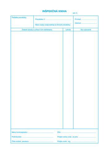 Kniha sa používa pri inšpekčnej kontrole. Obsahuje 25 x 3 listy, očíslované, perforovanie 1orginál a 2 kópie. A4 formát. Sfarbenie papiera biely, modré linky. Rozmery: 21 x 31 cm - samoprepis.