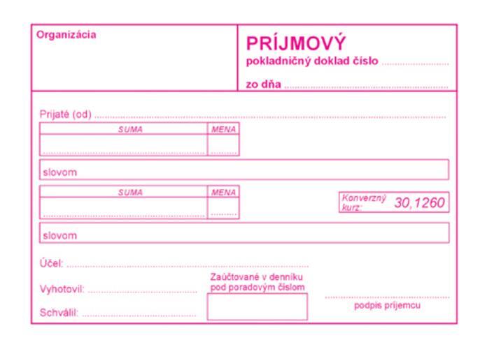 Tlačivo sa používa na príjem peňažnej hotovosti. Blok formátu A6 obsahuje 100 listov bezdreveného papiera. Potlač modrá.
