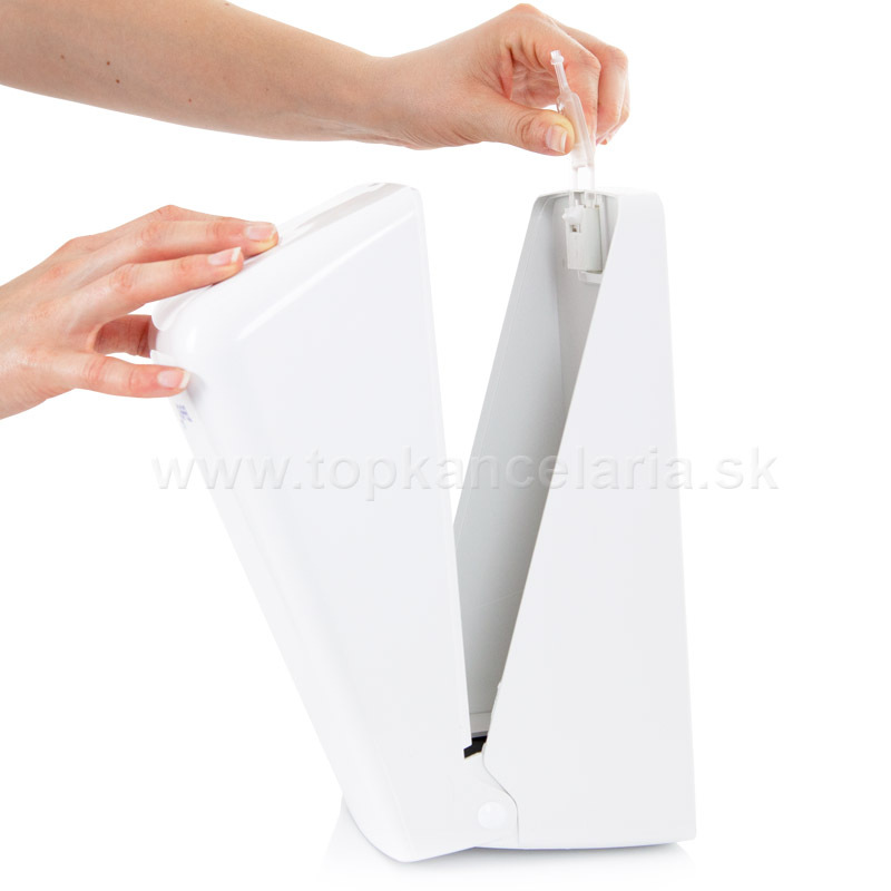 Plastový zásobník na utierky v roliach so stredovým odvíjaním pre maximálny priemer kotúča 13cm x výška 20,5cm. Presné odtrhávanie, ľahké a rýchle doplnenie papierových utierok v kotúči. Stačí zasunúť univerzálny plastový kľúč (kľúč je rovnaký pre všetky modely) a sklopiť prednú časť. Vložiť kotúč a privrieť. Vyrobený z extra pevného ABS plastu. Dávkovač je vhodný do prostredia hotely, reštaurácie, bary, ambulancie atď. Maximálna hygiena. Dotknete sa iba papiera, ktorý sa vytiahne a použije. Ľahká údržba a čistenie. Vonkajšie rozmery dávkovača v.33,4 x š.22 x h.23cm. Kotviaci materiál 4x hmoždinka so skrutkami sú súčasťou balenia.
