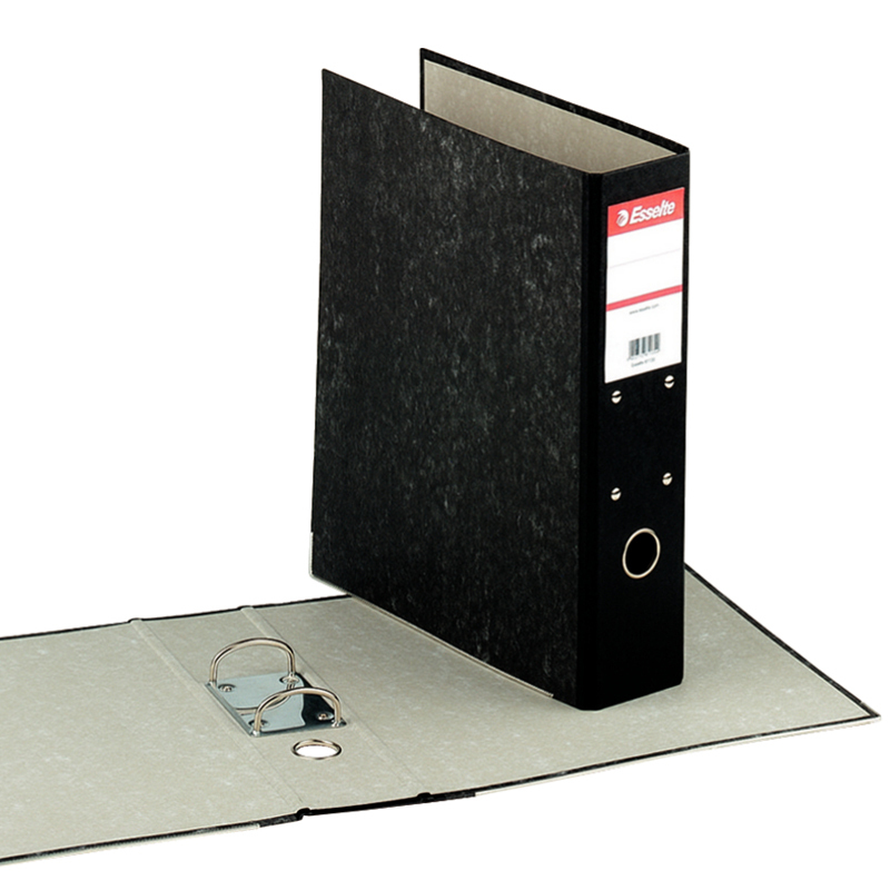 Čierny kartónový zakladač na závesné mapy formátu A4. Vonkajší poťah tmavý mramorovaný papier, čierny chrbát, vnútorný poťah svetlý mramorovaný papier. Šírka chrbta 75 mm. Chrbtový otvor pre ľahšie uchopenie. Kovové lišty kvôli dlhšej životnosti. Nalepovacia etiketa.