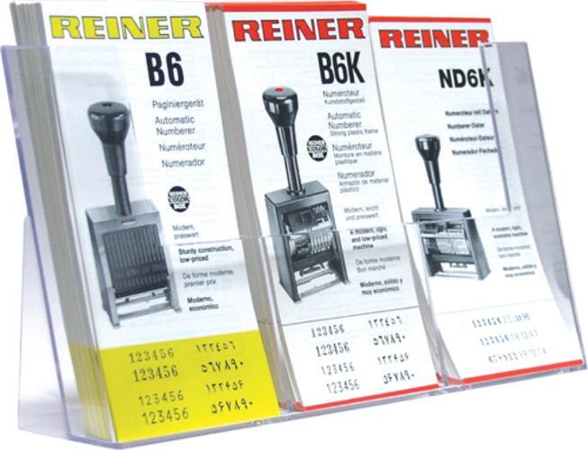 Jednoliaty stojanček vyrobený z číreho plastu pre buletiny a propagačné materiály pre formát 1/3 z A4.