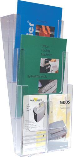 Závesný jednoliaty stojan s 3 priehradkami vyrobený z číreho plastu pre ukladanie buletinov a katalógov do formátu A4. Súčasťou balenia sú deliace priečky, vďaka ktorým sú priehradky rozdeliteľné na polovicu. Vnútorný rozmer jednej priečky je 230 x 245 x 30 mm (š x v x h).
