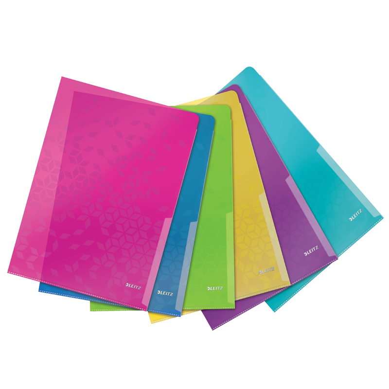 Obaly na dokumenty typu L v dizajne Leitz WOW. Kapacita obalov 40 hárkov papiera A4. Sú vyrobené extrémne odolného a pevného materiálu. Balenie obsahuje 6ks obalov vo farbe ľadová modrá, metalická modrá, ružová, žltá, zelená a purpurová.