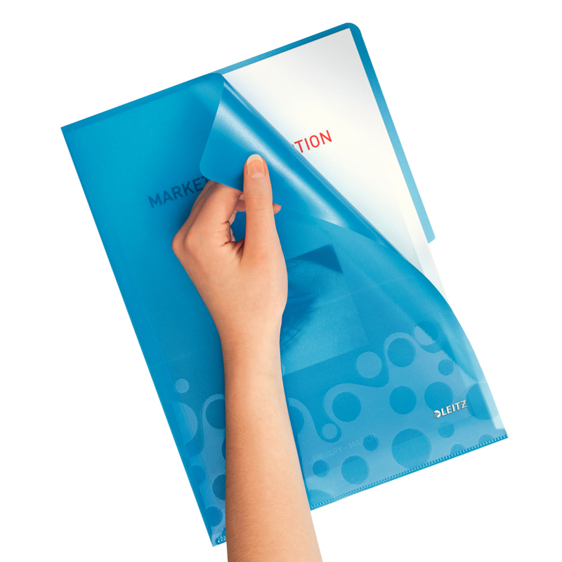 Plastové obaly na prenášanie, organizovanie a ukladanie dokumentov v dizajne Leitz WOW. Má jednoduché uzatváranie pomocou plastových cvočiek. Kapacita obalov až 120 hárkov papiera A4. Sú vyrobené extrémne odolného a pevného materiálu. Balenie obsahuje 6ks obalov vo farbe ľadová modrá, metalická modrá, ružová, žltá, zelená a purpurová.