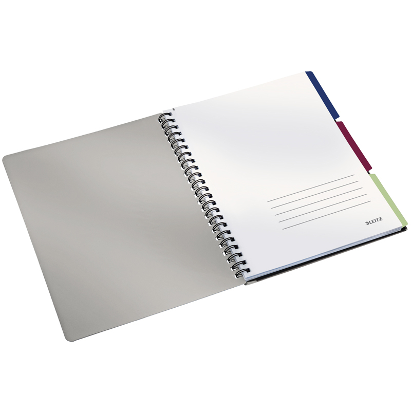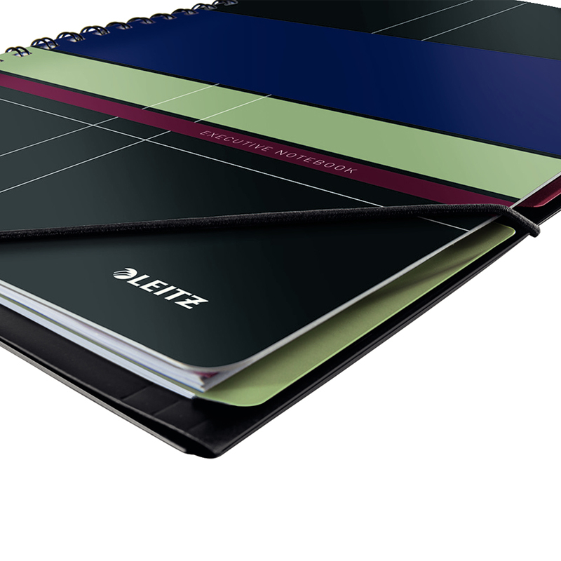 Mobilný linajkový poznámkový blok A4 Leitz Executive s uzatváraním na gumičku. Štítový extra pevný obal ktorý slúži aj ako podložka na písanie. Mobilný blok obsahuje 80 listov vyrobené z 90g perforovaného papiera. Mikroperforácia pre jednoduché vytrhnutie, odnímateľné pravítko, ktoré slúži aj ako záložka. Obsahuje 3 odnímateľné deliace listy a integrovaný obal s 3 priehradkami na dočasnú úschovu voľných dokumentov. Farba Style design