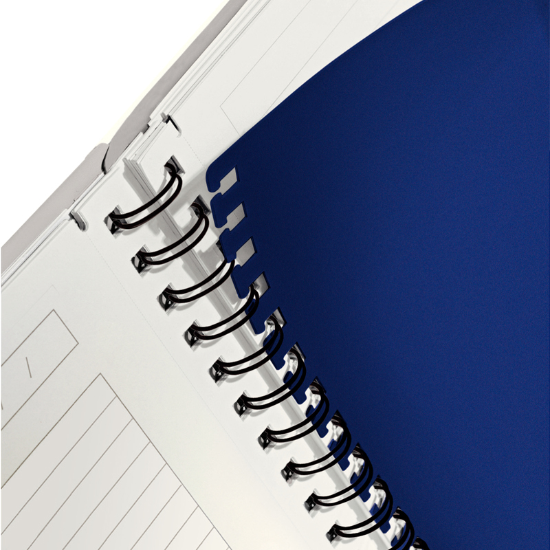 Mobilný poznámkový blok A4 z rady Leitz WOW s linajkami. Vonkajší obal v žiarivých farbách, uzatváraním na gumičku. Zadný trojchlopňový obal zároveň slúži aj ako priestor na voľne vkladanie dokumentov. Poznámkový blok je vybavený s úchytom na pero a zo samolepiacimi záložkami. Súčasťou bloku sú aj 3 deliace listy. Blok obsahuje 80 listov perforovaného papiera. Štyri diery pre jednoduché vkladanie do krúžkového, alebo pákového zakladača. Farba metalická modrá