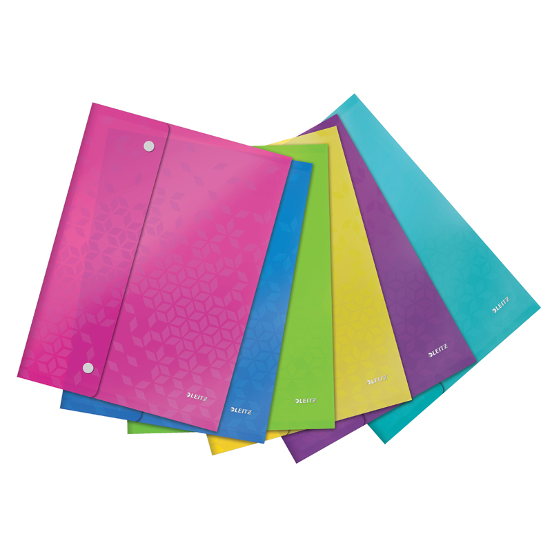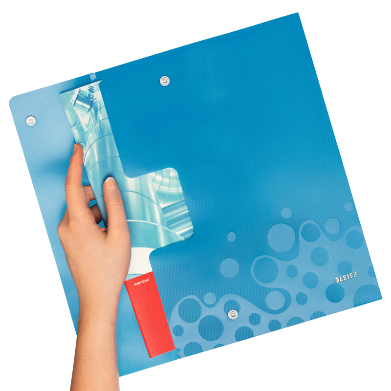 Plastové obaly na prenášanie, organizovanie a ukladanie dokumentov v dizajne Leitz WOW. Má jednoduché uzatváranie pomocou plastových cvočiek. Kapacita obalov až 120 hárkov papiera A4. Sú vyrobené extrémne odolného a pevného materiálu. Balenie obsahuje 6ks obalov vo farbe ľadová modrá, metalická modrá, ružová, žltá, zelená a purpurová.