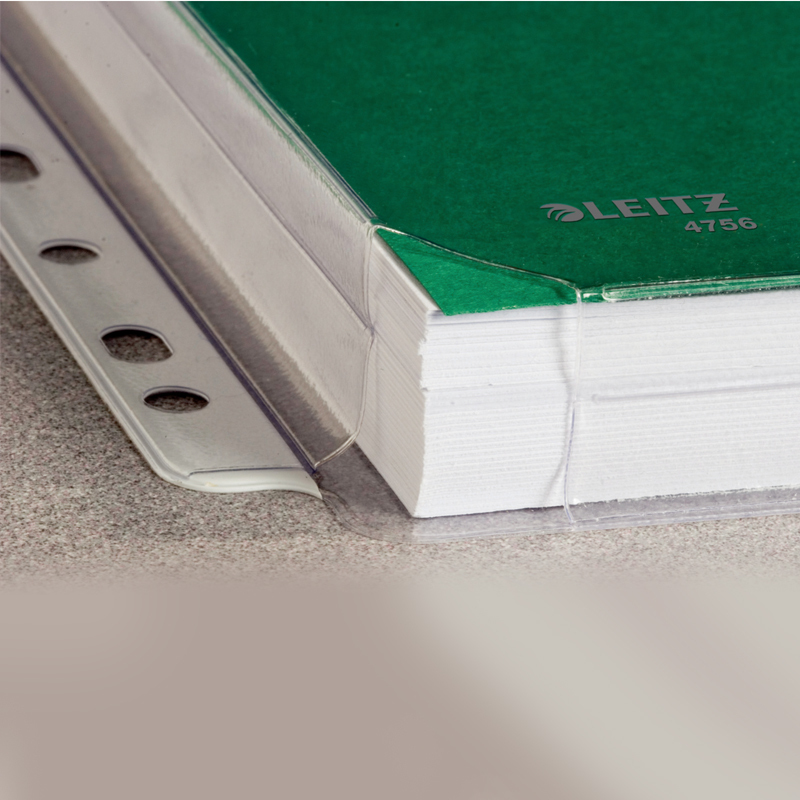 Závesné prospektové euroobaly Leitz A4 s rozšírenou kapacitou a s chlopňou. Vďaka veľkej kapacite sú zvlášť vhodné na zakladanie katalógov, cenníkov a objemnejších dokumentov. Vyrobené z pevného hrubého polypropylénu hrúbky 170 mikrónov kvôli dlhej životnosti, hladký povrch. Spodný a bočný klin o šírke 20 mm zvyšuje kapacitu obalu, otvorené spodné rohy obalov zabezpečia, že sa rohy vašich objemnejších dokumentov v obale neohnú a nezničia. Multiperforácia je zosilnená bielym plastovým prúžkom a je vhodná na založenie obalu do pákového aj krúžkového zakladača. Formát A4 s chlopňou. Kapacita obalu až 200 listov 80g/m2. Vyrobené z pevného hladkého PVC hrúbky 170mic. Balenie sáčok 5ks.