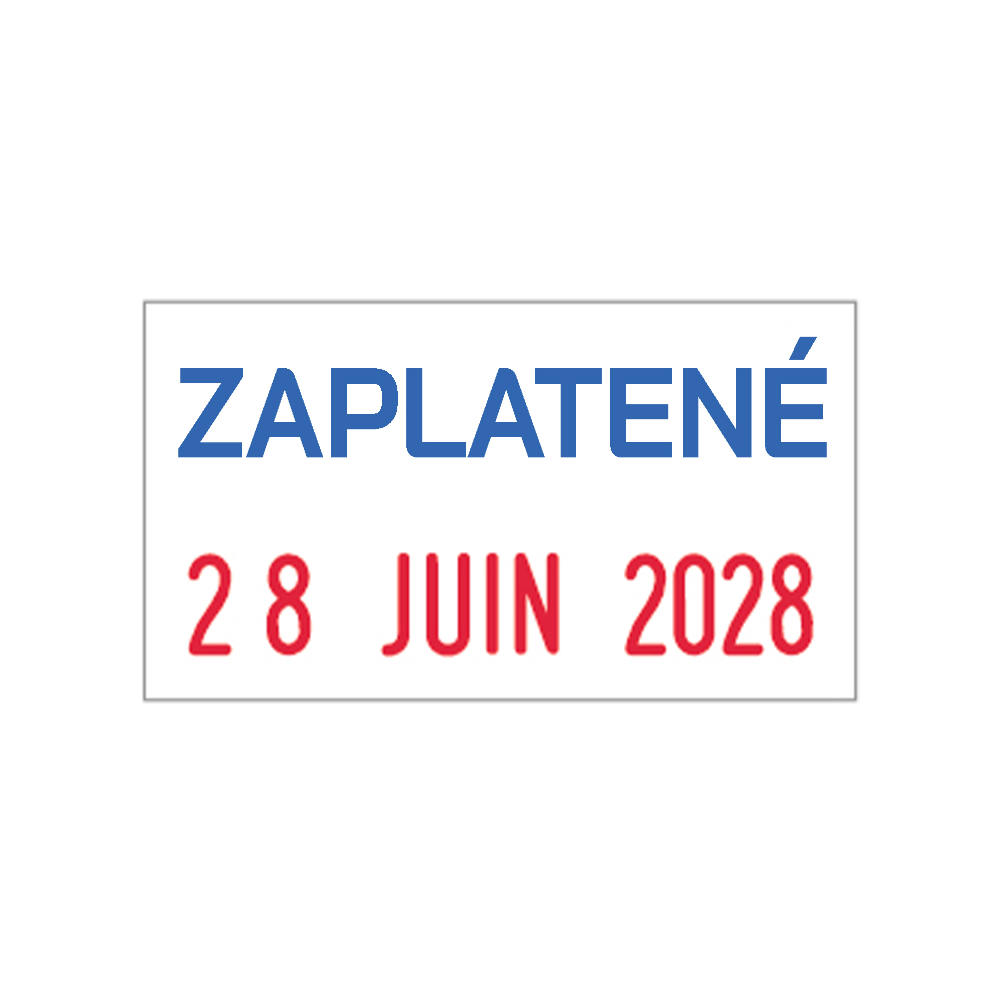 Plastová samofarbiaca pečiatka. Nastaviteľný text pred dátumom. - Výška znakov: 3,8 mm - Typ odtlačku: ZAPLATENÉ 12-08-2005 - Ďalšie texty: DOŠLO DŇA, ZAÚČTOVANÉ, VYBRANÉ DŇA, VLOŽENÉ DŇA, FAKTUROVANÉ, @-MAIL DŇA, INVENTÚRA, OBJEDNANÉ, ODOSLANÉ, UPOMIENKA, VYBAVENÉ DŇA. - Balenie: 10 ks