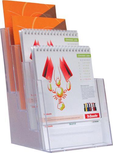 Jednoliate stojančeky vyrobené z číreho plastu pre buletiny a propagačné materiály pre formát A5. Priečinky majú na spodku naviac drážky, vďaka ktorým sa v ňom uložené propagačné materiály nešmýkajú a stoja rovno.