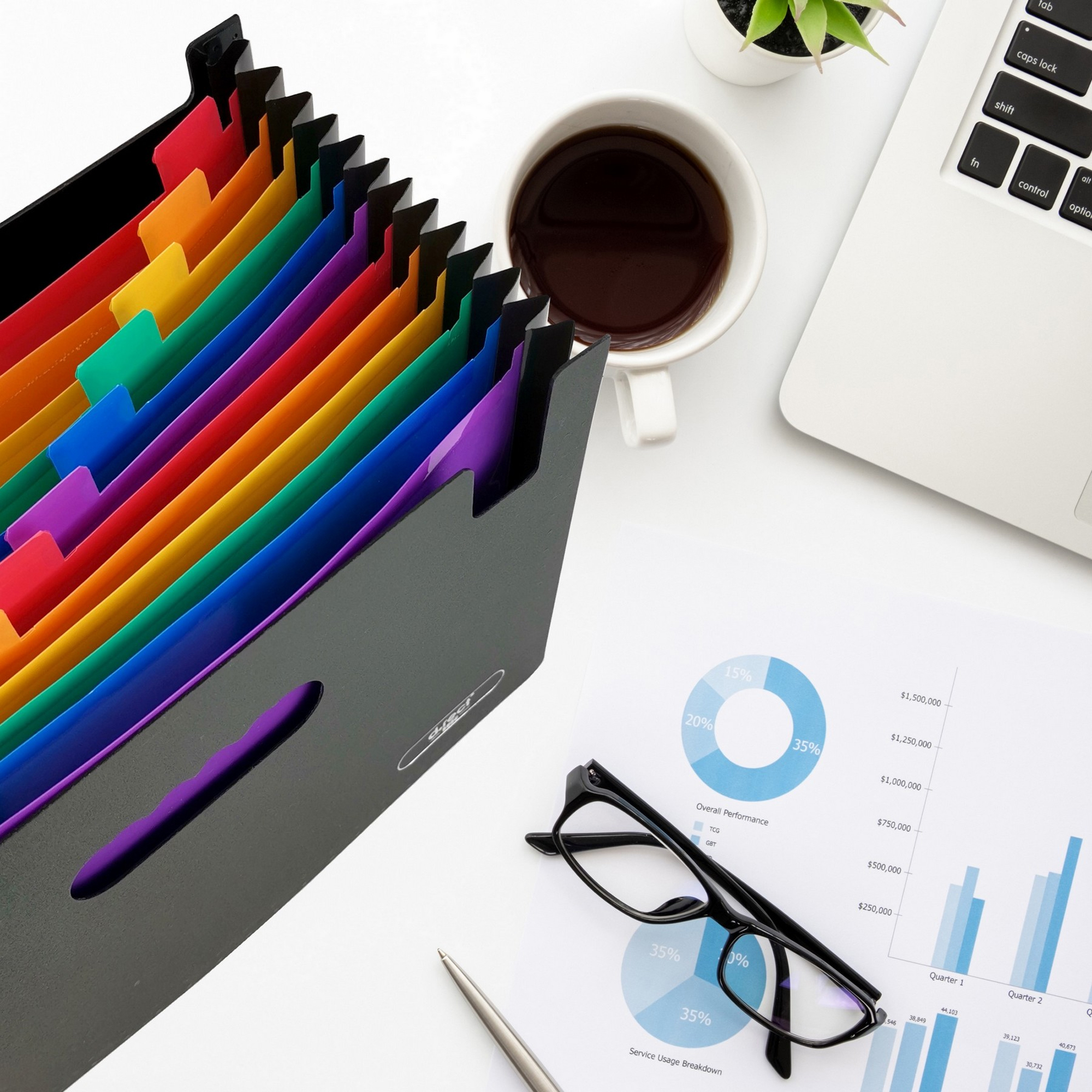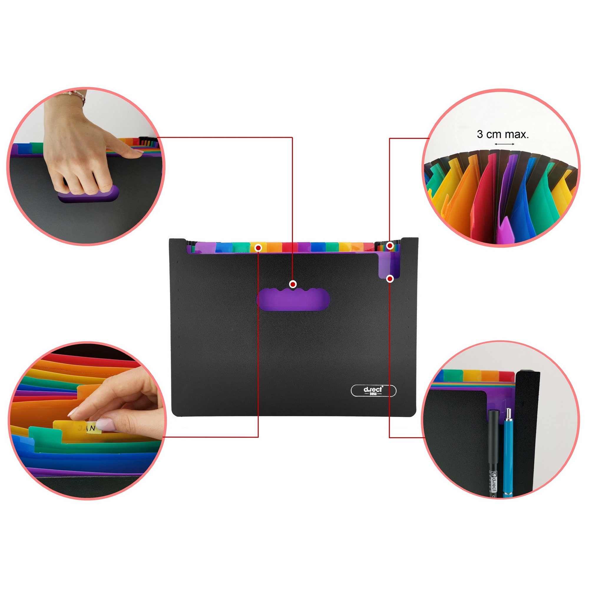 Nehľadaj to – ulož to. Praktický úložný box s 13 priehradkami na dokumenty je ideálnym spoločníkom pre každého, kto si potrebuje mať svoje dokumenty triedené alebo prehľadné uložené. Box sa automaticky rozširuje podľa množstva vložených dokumentov. Táto výhoda umožňuje prispôsobiť sa vašim potrebám až do maximálnej šírky 36 cm. Box s priehradkami bol navrhnutý tak, aby poskytoval prehľadné usporiadanie dôležitých dokumentov do A4. Jeho elegantný vzhľad vám zaručí profesionálny výzor, či už ste na obchodnom stretnutí alebo v kancelárii. Vyrobený z pevného materiálu s držadlami pre ľahké prenášanie. Tento univerzálny box na triedenie dokumentov je spoľahlivý a praktický pre každodenné použitie. Jeho vysoko kvalitný ekologický PP materiál s dobrou elasticitou zaisťuje dlhú životnosť a odolnosť. Okrem toho môžete využiť štítky, ktoré sú súčasťou balenia, na a označenie vašich súborov. S týmto úložným boxom budete mať vaše dokumenty vždy na dosah ruky a usporiadané tak, ako potrebujete. Nehľadaj to – ulož to. Maximálne rozmery: 36 x 33 x 23,5 cm. Farba: číerná