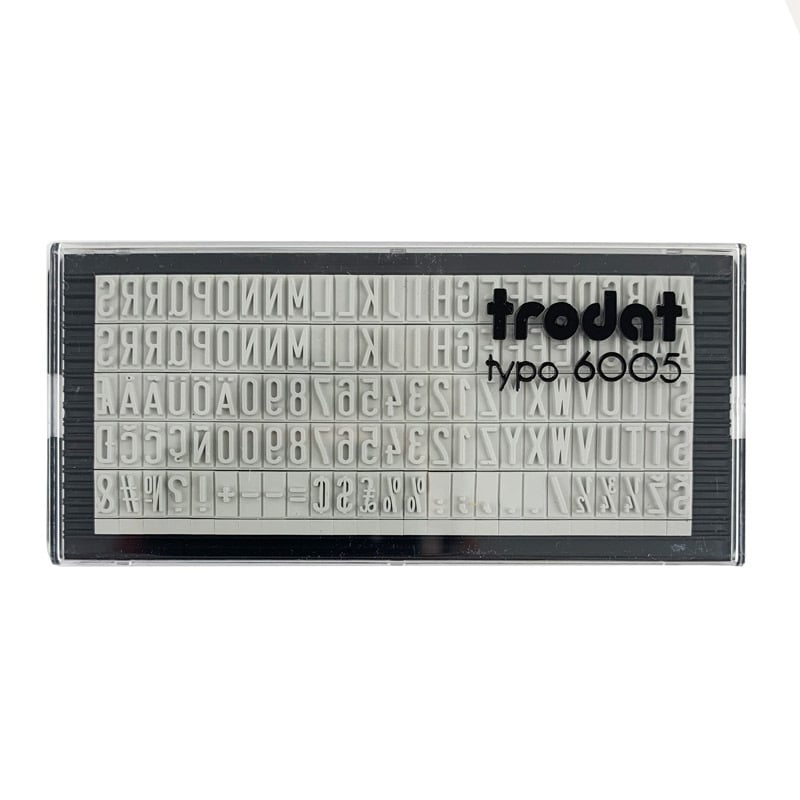 Sada znakov pre pečiatky TRODAT TYPOMATIC - Výška znakov: 5 mm (288 znakov) - Verzálky, písmená rovnakej výšky i s diakritikou, číslice, symboly, logotypy) - Balenie: 10 ks