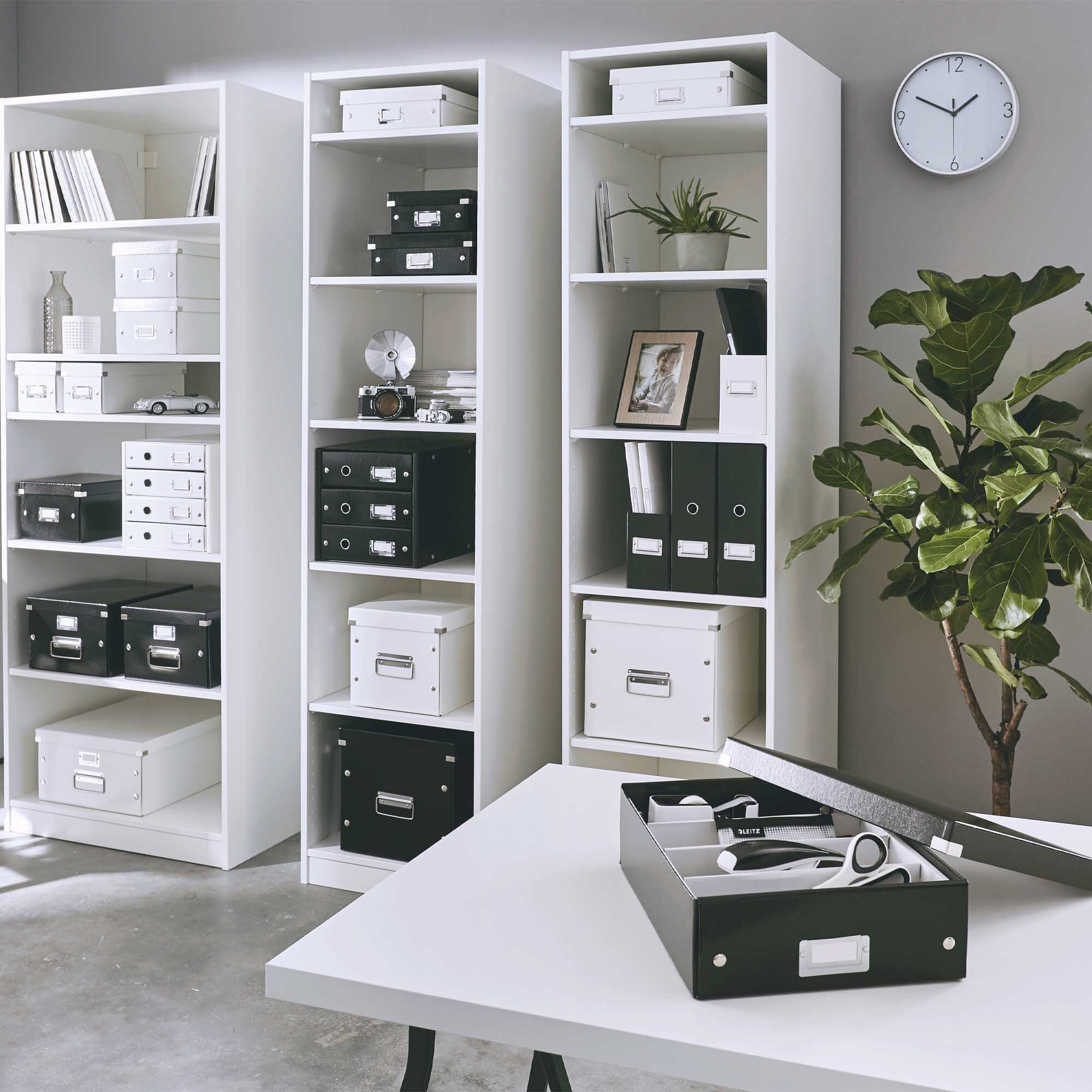 Stredne velká čierna štýlová škatuľa na prehľadné ukladanie drobností. Lesklé PP vyhotovenie vytvára prvotriedny vzhľad škatule a umožňuje dlhodobé používanie a jednoduché utieranie prachu. Má kvalitné kovové rámčeky na popis obsahu s kontrastnými bielymi štítkami. Moderný dizajn, ktorý sa vyníma v každej kancelárii. Dodajte svojmu pracovnému miestu alebo domácnosti farbu a skombinujte škatuľu s ostatnými kancelárskymi výrobkami z radu Leitz WOW. Vyrobené z hrubého kartónu s laminovaným povrchom a kovovými rohmi pre spoľahlivú ochranu. Patentovaná konštrukcia zaručuje stohovateľnosť a vyššiu ochranu proti náhodnému rozloženiu škatule pri prenášaní ťažkých vecí. Premyslená skladacia konštrukcia na rýchle a jednoduché zloženie bez nutnosti použitia skrutiek. Možnosť opätovného rozloženia a uloženie do veka keď škatuľu práve nepotrebujete. Váha 0,57 kg. Rozmery 206 x 147 x 352 (mm).