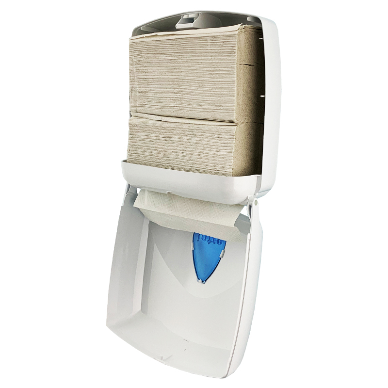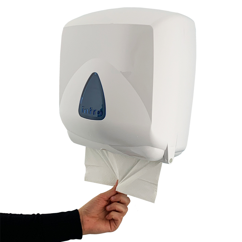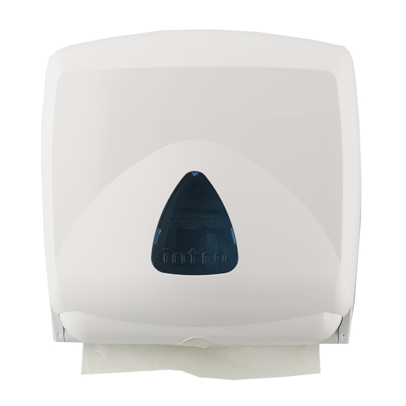 Plastový zásobník INTROt na skladané ZZ utierky. Univerzálny dávkovač papierových utierok funguje so všetkými typmi skladacích utierok C-Fold, Non Stop, One Stop a Zig Zag s maximálnou šírkou do 240 mm. Rozmery v30 x š15 x d30cm