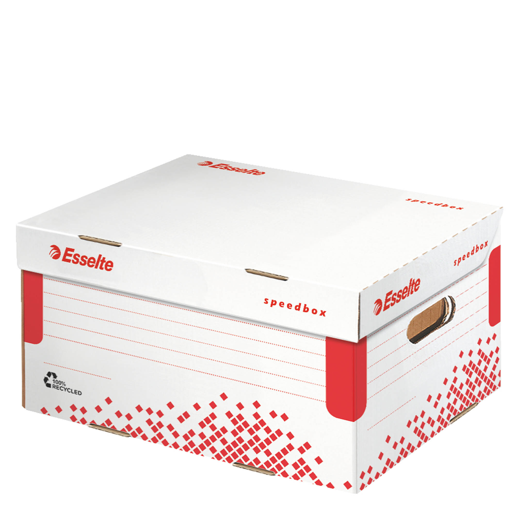 Darček 3 ks Esselte Home..... Zloženie archivačných škatúľ Esselte Speesdbox S pre dokumenty A4 trvá pár sekúnd, jedným pohybom bez potreby manuálu. Ideálny pre prenos dokumentov alebo rôznych predmetov na prezentáciu či schôdzky. Má integrované veko, spevnené steny i dno pre maximálnu pevnosť a odolnosť pri stohovaní. Vhodné pre dokumenty formátu A4, dosky na spisy A4 i papiere formátu Foolscap. Inovatívna konštrukcia rýchleho zloženia, ktorá šetrí čas. Vyrobené zo 100% recyklovanej vlnitej lepenky, 100% recyklovateľné, certifikované FSC®. Rozmery 355 x 193 x 252 (mm).