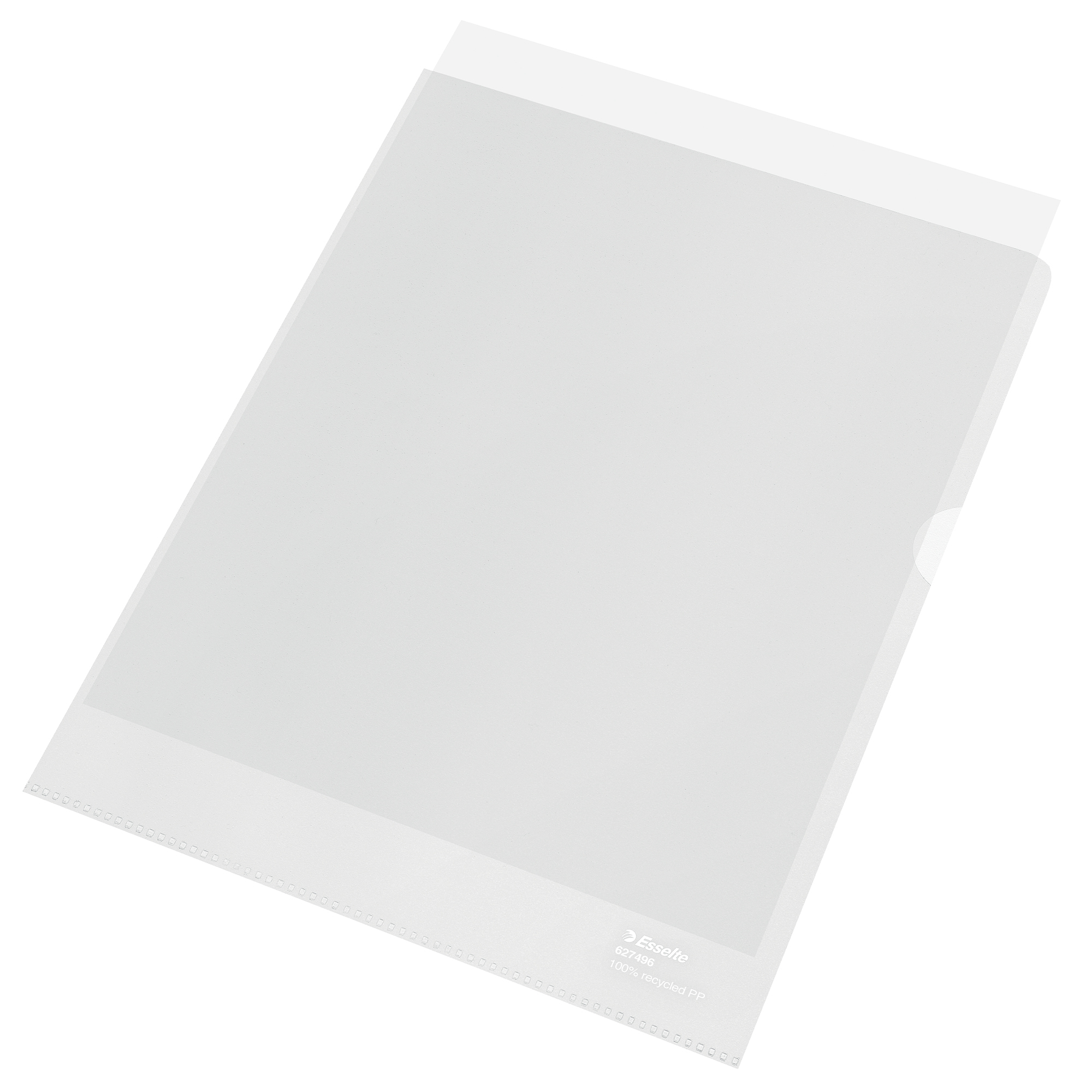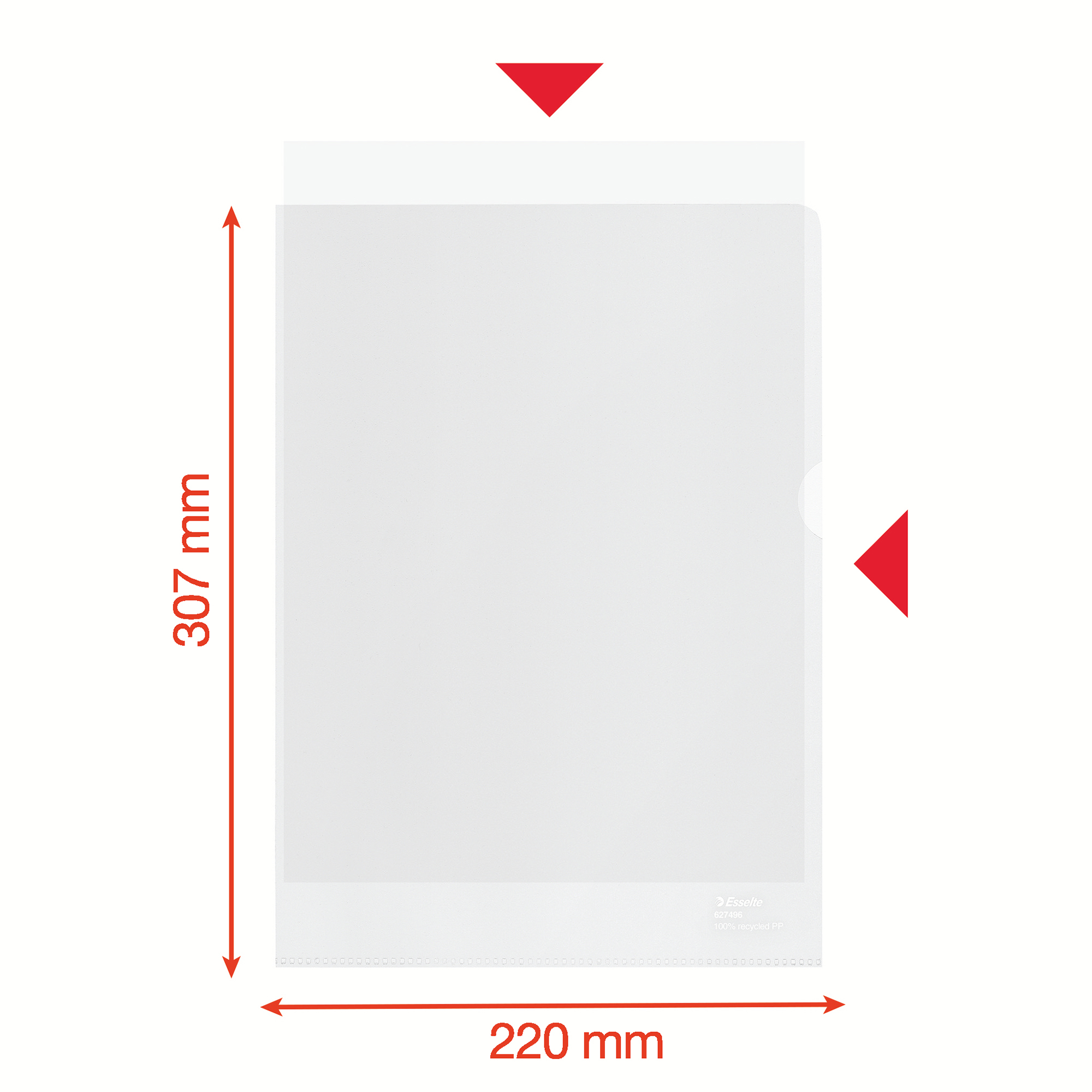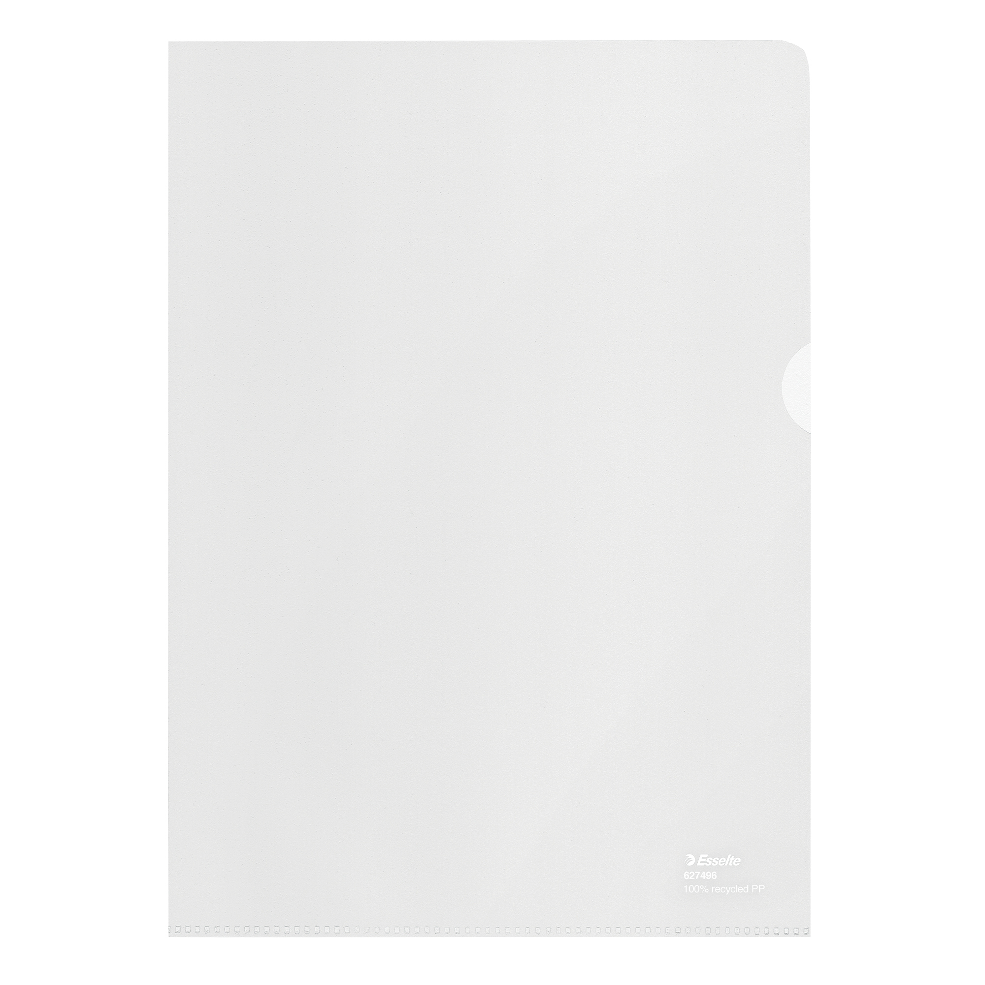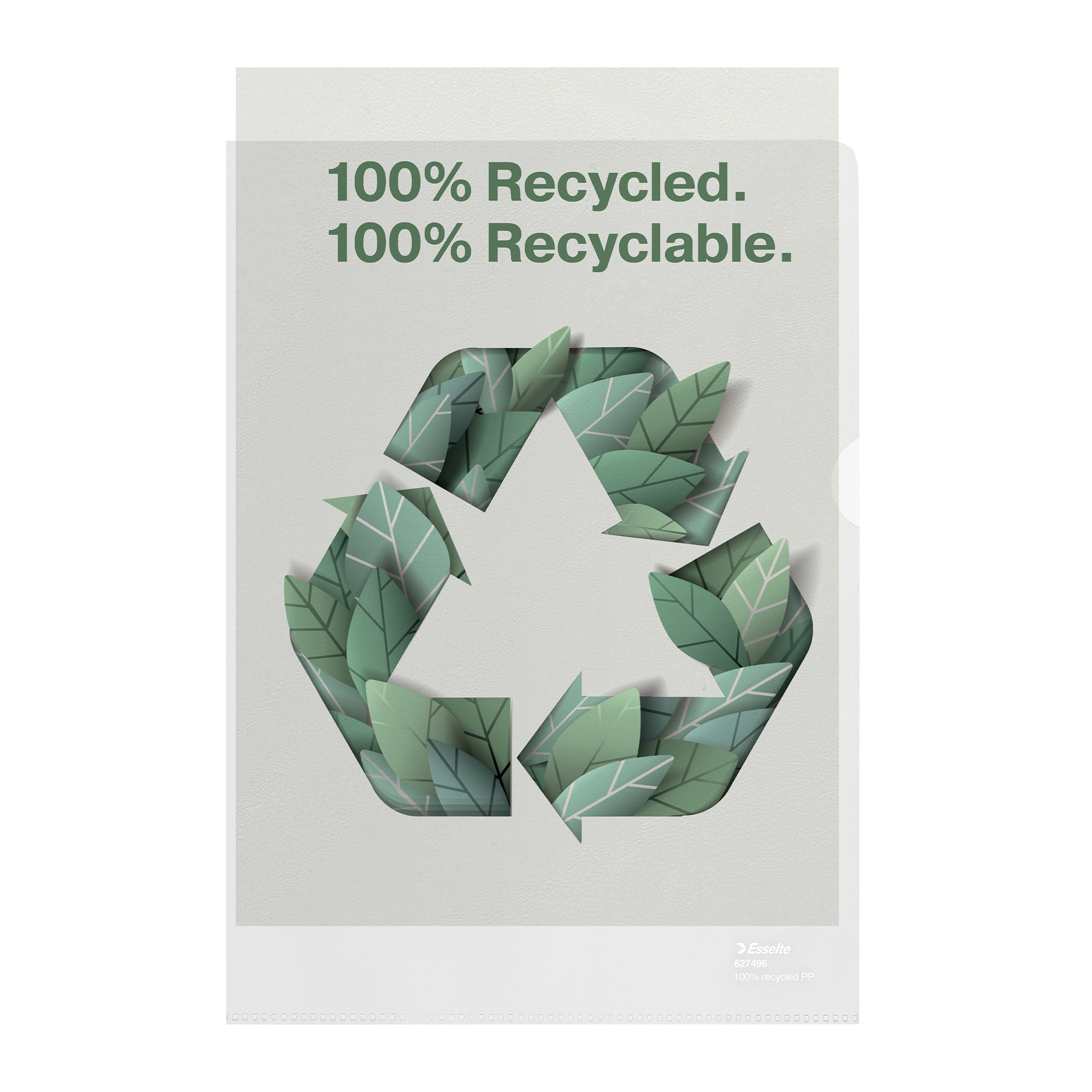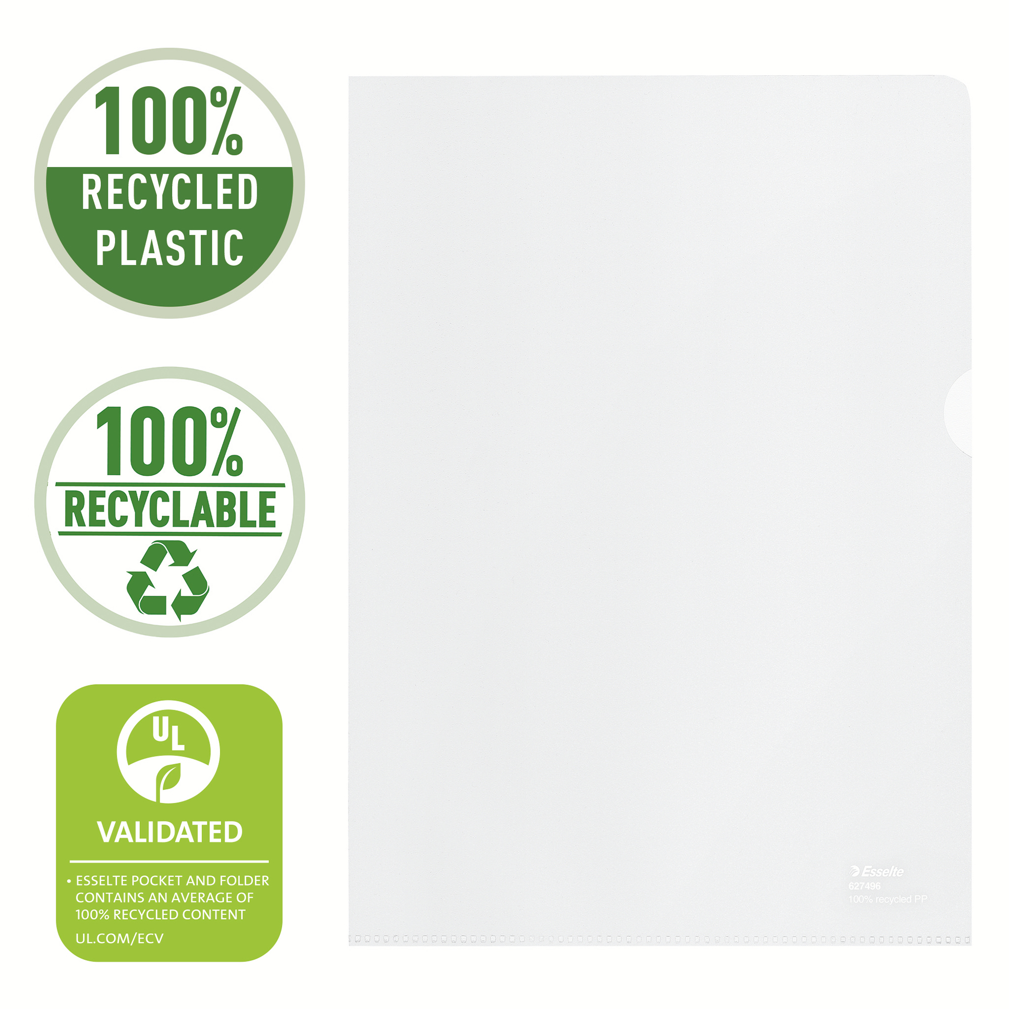 Ekologický obal typu L na prenášanie, ochranu a prezentáciu dokumentov. S jednoduchým prístupom k obsahu vďaka otváraniu z hornej a pravej strany. Vyrobené zo 100% recyklovaného netoxického plastu (PP) a celý výrobok je 100% recyklovateľný. Materiál bez obsahu kyselín chráni pred žltnutím papiera, takže je ideálny na dlhodobú archiváciu dôležitých dokumentov. Univerzálna multiperforácia umožňuje pohodlné ukladanie dokumentov do pákových a krúžkových zakladačov. Je zabalený do kartónovej škatule, ktorá je tiež 100% recyklovaná a recyklovateľná. Celý výrobok možno opätovne použiť a aj znovu recyklovať. Vyrobené v Európe. Recyklovaný obsah potvrdený UL. Rozmery. 230 x 1 x 302 (mm)