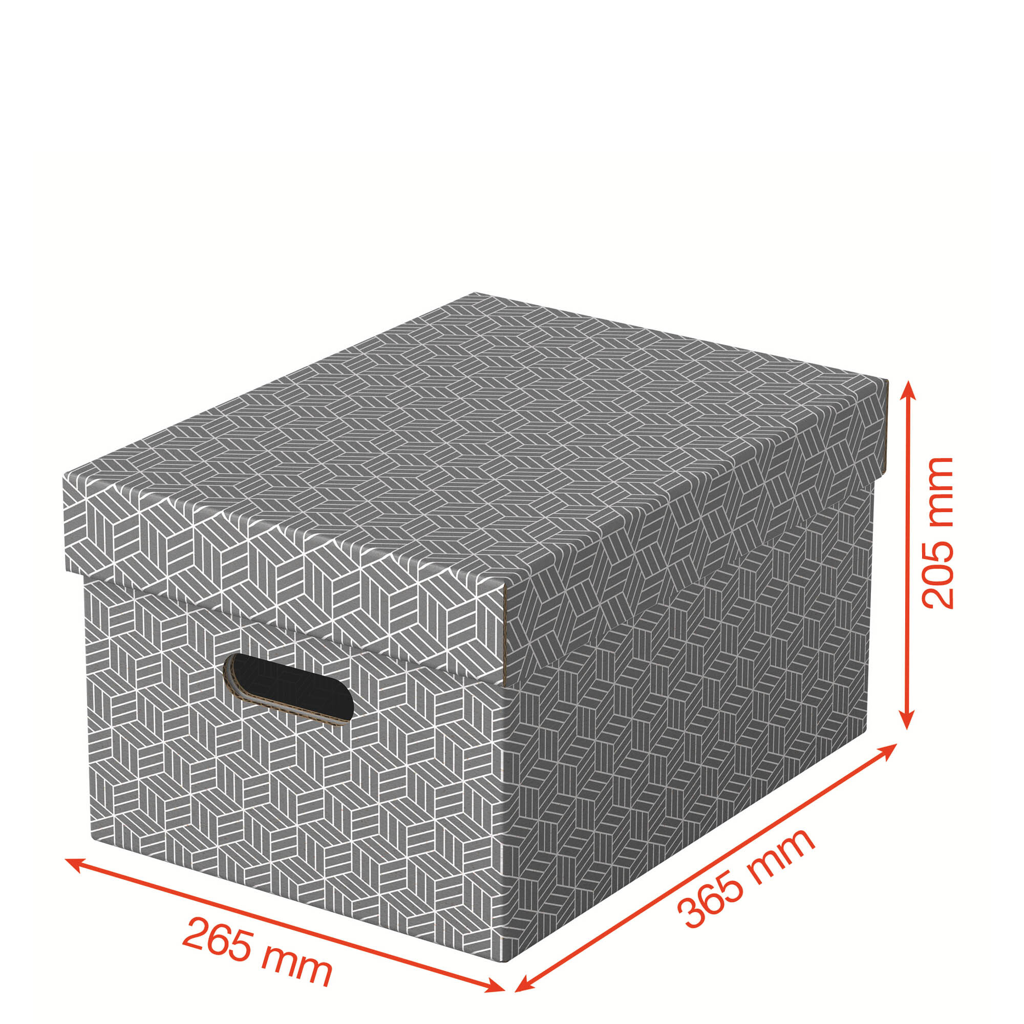 Súprava troch stredne veľkých šedých úložných boxov s moderným a štýlovým geometrickým dizajnom. Každý box má 2 úchyty a veko. Takže ich môžete podľa potreby ľahko prenášať z miestnosti do miestnosti. Odnímateľné veko skryje obsah a ochráni ho pred prachom. Súprava troch boxov rovnakej veľkosti, ktoré môžete použiť samostatne, uložiť ich na policu alebo do hranatých úložných jednotiek a skladovať v nich drobnosti, ako sú fotografie alebo osobné dokumenty. Všetko v nich bude úhľadne zorganizované a prehľadné. Utierateľný povrch má dvojfarebný geometrický dizajn. Neutrálne farby dodajú štýl vášmu interiéru. Dodávané sú v rozloženom stave, zabalené naplocho a dajú sa rýchlo a ľahko zostaviť. Steny sa počas zostavovania preložia cez seba, to dodá boxu dvojnásobnú pevnosť, aby bol robustný a jeho obsah dostatočne chránený. Vyrobené z pevnej 100% recyklovanej a 100% recyklovateľnej vlnitej lepenky s certifikáciou FSC. Rozmery 265 x 205 x 365