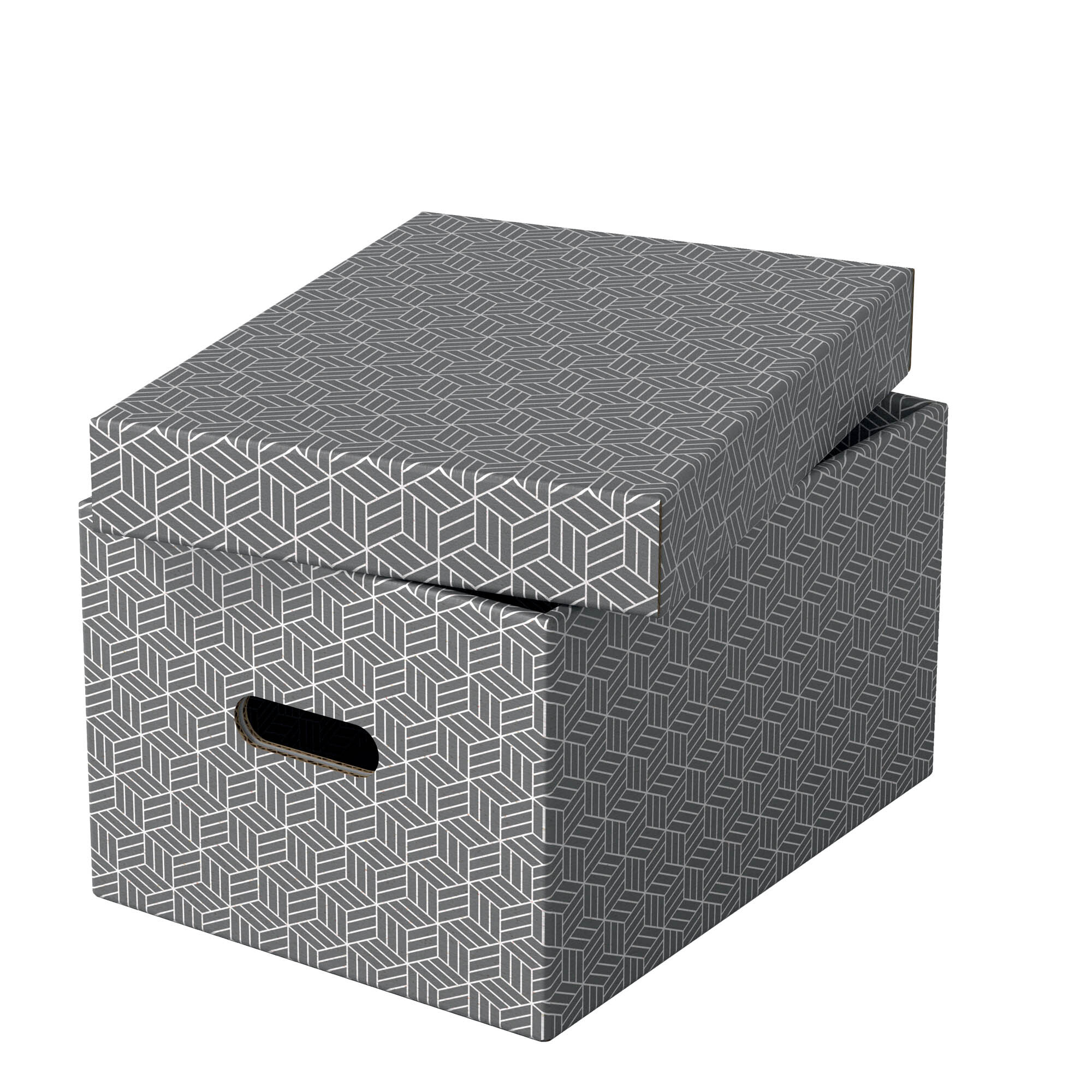 Súprava troch malých šedých úložných boxov s moderným a štýlovým geometrickým dizajnom. Ideálne aj na zabalenie darčekov. Ak box previažete stuhou, budete mať darčekovú krabicu! Keď si obdarovaný svoj darček rozbalí, môže si škatuľku ponechať na ukladanie vecí, takže vlastne darujete 2 darčeky v jednom. Súprava troch boxov rovnakej veľkosti, ktoré môžete použiť samostatne, uložiť ich na policu alebo do hranatých úložných jednotiek a skladovať v nich drobnosti, ako sú fotografie alebo osobné dokumenty. Všetko v nich bude úhľadne zorganizované a prehľadné. Utierateľný povrch má dvojfarebný geometrický dizajn, ktorý dodá štýl vášmu interiéru. Dodávané sú v rozloženom stave, zabalené naplocho a dajú sa rýchlo a ľahko zostaviť. Steny sa počas zostavovania preložia cez seba, to dodá boxu dvojnásobnú pevnosť, aby bol robustný a jeho obsah dostatočne chránený. Vyrobené z pevnej 100% recyklovanej a 100% recyklovateľnej vlnitej lepenky s certifikáciou FSC. Rozmery 200 x 150 x 255