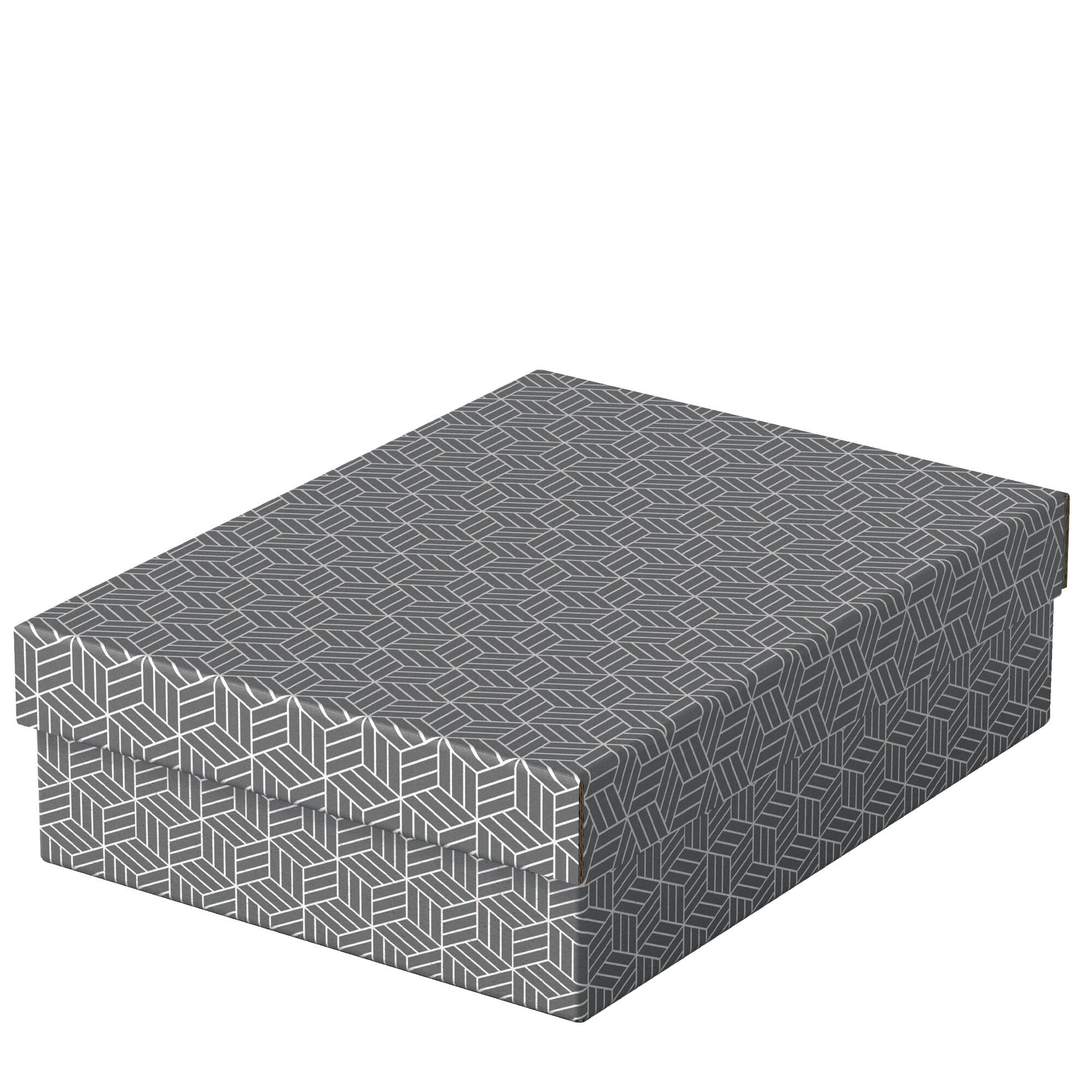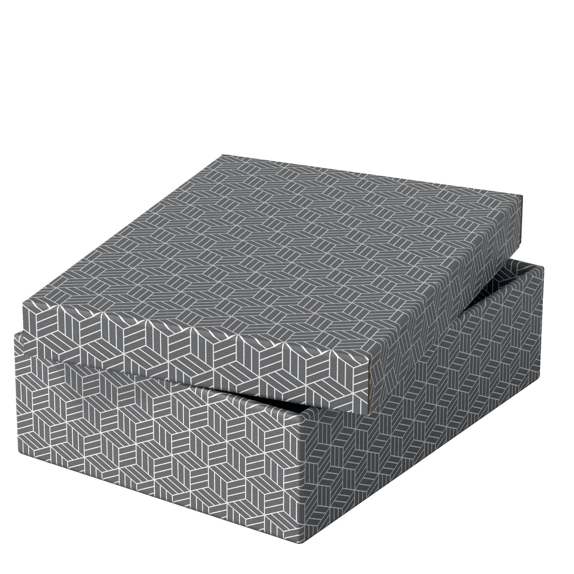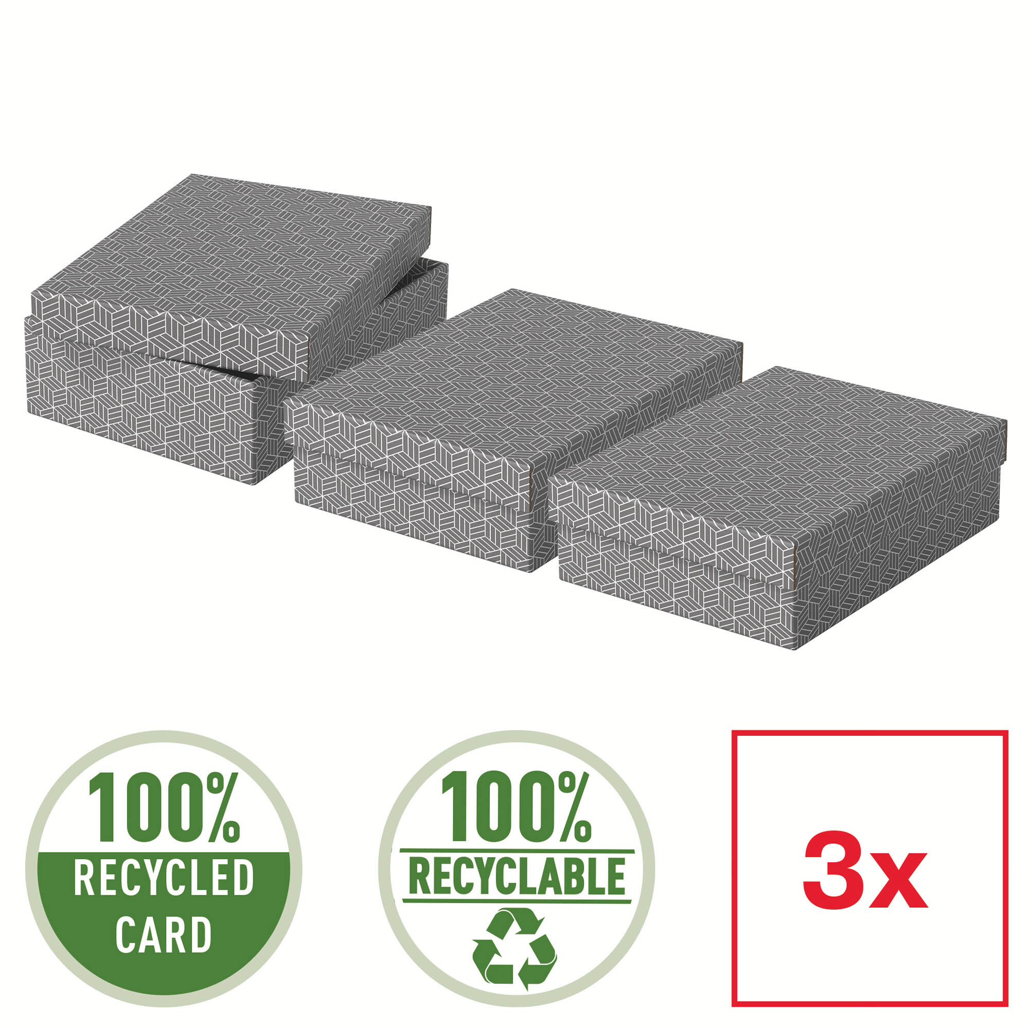Súprava troch boxov rovnakej veľkosti, ktoré môžete použiť samostatne, uložiť ich na policu alebo do hranatých úložných jednotiek a skladovať v nich drobnosti, ako sú fotografie alebo osobné dokumenty. Všetko v nich bude úhľadne zorganizované a prehľadné. Utierateľný povrch má dvojfarebný geometrický dizajn, ktorý dodá štýl vášmu interiéru. Dodávané sú v rozloženom stave, zabalené naplocho a dajú sa rýchlo a ľahko zostaviť. Steny sa počas zostavovania preložia cez seba, to dodá boxu dvojnásobnú pevnosť, aby bol robustný a jeho obsah dostatočne chránený. Vyrobené z pevnej 100% recyklovanej a 100% recyklovateľnej vlnitej lepenky s certifikáciou FSC. Rozmery 265 x 100 x 360