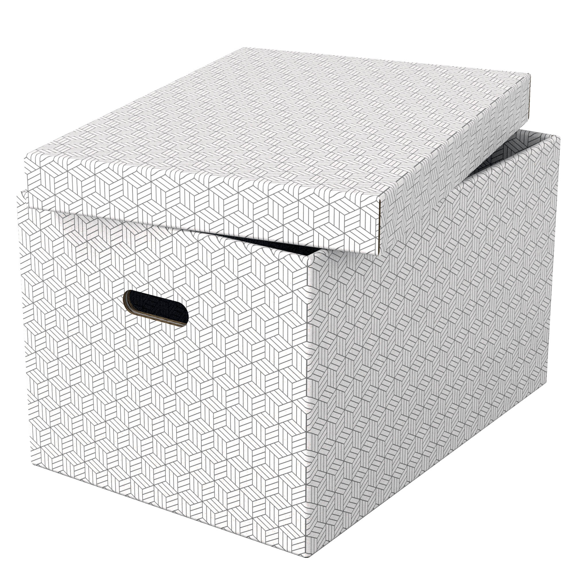 Súprava troch stredne veľkých bielych úložných boxov s moderným a štýlovým geometrickým dizajnom. Každý box má 2 úchyty, takže ich môžete podľa potreby ľahko prenášať z miestnosti do miestnosti. Odnímateľné veko skryje obsah a ochráni ho pred prachom. Súprava troch boxov rovnakej veľkosti, ktoré môžete použiť samostatne, uložiť ich na policu alebo do hranatých úložných jednotiek a skladovať v nich drobnosti, ako sú fotografie alebo osobné dokumenty. Všetko v nich bude úhľadne zorganizované a prehľadné. Utierateľný povrch má dvojfarebný geometrický dizajn. Neutrálne farby dodajú štýl vášmu interiéru. Dodávané sú v rozloženom stave, zabalené naplocho a dajú sa rýchlo a ľahko zostaviť. Steny sa počas zostavovania preložia cez seba, to dodá boxu dvojnásobnú pevnosť, aby bol robustný a jeho obsah dostatočne chránený. Vyrobené z pevnej 100% recyklovanej a 100% recyklovateľnej vlnitej lepenky s certifikáciou FSC. Rozmery 265 x 205 x 365