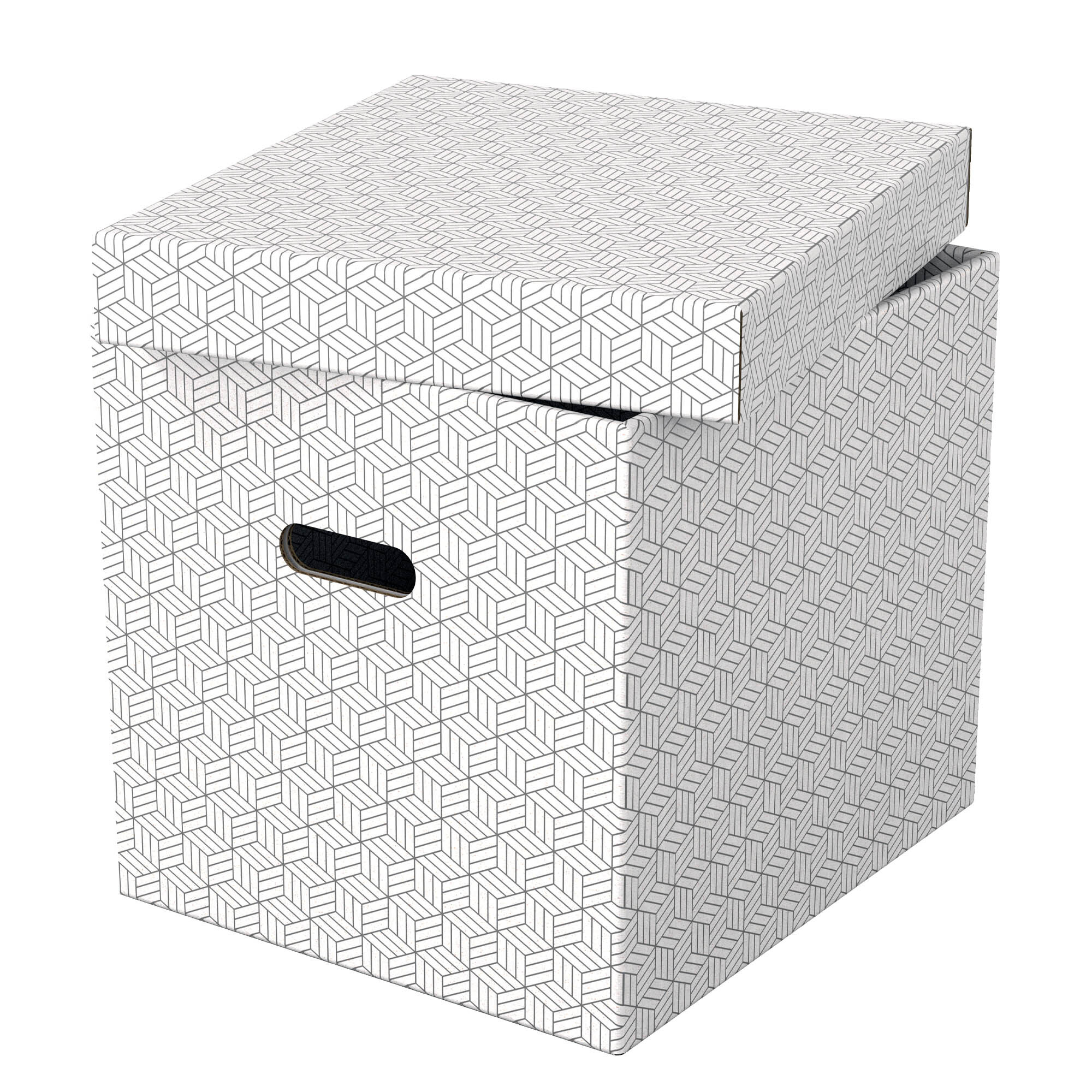 Súprava troch boxov rovnakej veľkosti, ktoré môžete použiť samostatne, uložiť ich na policu alebo do šatníka. Má ideálne rozmery na ukladanie dokumentov, pákových zakladačov, hračiek, kníh a ďalších väčších predmetov. Všetko v nich bude úhľadne zorganizované a prehľadné. Utierateľný povrch má dvojfarebný geometrický dizajn. Neutrálne farby dodajú štýl vášmu interiéru. Dodávané sú v rozloženom stave, zabalené naplocho a dajú sa rýchlo a ľahko zostaviť. Steny sa počas zostavovania preložia cez seba, to dodá boxu dvojnásobnú pevnosť, aby bol robustný a jeho obsah dostatočne chránený. Vyrobené z pevnej 100% recyklovanej a 100% recyklovateľnej vlnitej lepenky s certifikáciou FSC. Obal je 100% recyklovaný a 100% recyklovateľný bez obsahu plastov. Rozmery 320 x 315 x 365