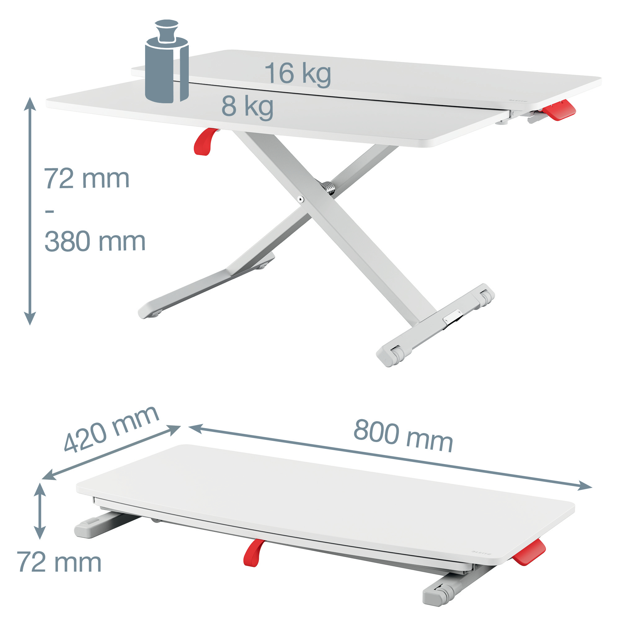 Pneumatický zdvíhací mechanizmus umožňuje jednoduché a rýchle prepínanie medzi polohou v sede a postojačky. Tento "stôl na stole" sa dá rýchlo nastaviť na požadovanú výšku a premení akýkoľvek bežný stôl na mobilný pracovný priestor, ktorý sa ľahko prispôsobí a zároveň zostáva pevný a stabilný v akejkoľvek výške. Minimálna výška nastavenia 68 mm, maximálna 447 mm. Tento štýlový pracovný „stôl na stole“ s minimalistickým a moderným dizajnom zlepší vaše zdravie a pohodu a pomôže vytvoriť ideálne aktívne pracovné prostredie práve pre vás. V kombinácii s ostatnými výrobkami Leitz Ergo získate príjemný a flexibilný pracovný priestor, ktorý vás udrží v pohybe a pohode po celý deň. Rozmer pracovnej dosky 800 x 350 mm. Celkové rozmery 420 x 72 x 800 (mm). Váha 16,02 kg. Záruka 5 rokov.