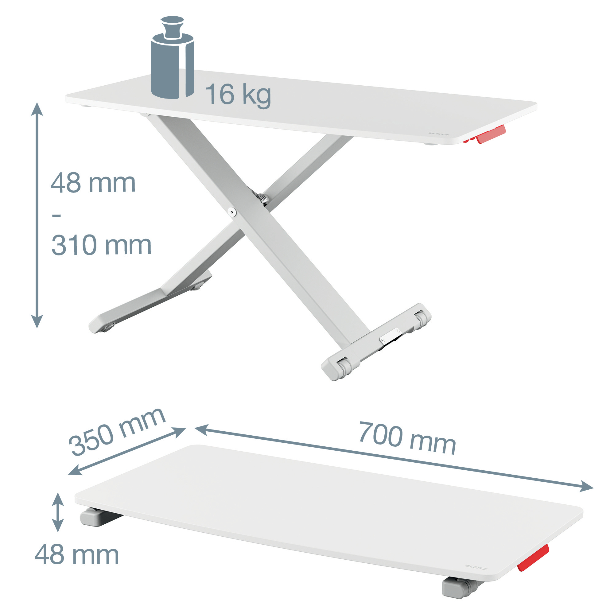 Doplnok pracovného stola pre prácu v sede alebo v stoji. Výsuvná doska pod klávesnicu a myš vám umožňuje flexibilne meniť polohu pri práci. Striedanie sedenia a státia podporuje prirodzený pohyb svalov a minimalizuje negatívne účinky sedenia na Vaše zdravie. Pneumatický zdvíhací mechanizmus umožňuje jednoduché a rýchle prepínanie medzi polohou v sede a postojačky. Tento "stôl na stole" sa dá rýchlo nastaviť na požadovanú výšku a premení akýkoľvek bežný stôl na mobilný pracovný priestor, ktorý sa ľahko prispôsobí a zároveň zostáva pevný a stabilný v akejkoľvek výške. Minimálna výška nastavenia 68 mm, maximálna 447 mm. Tento štýlový pracovný „stôl na stole“ s minimalistickým a moderným dizajnom zlepší vaše zdravie a pohodu a pomôže vytvoriť ideálne aktívne pracovné prostredie práve pre vás. V kombinácii s ostatnými výrobkami Leitz Ergo získate príjemný a flexibilný pracovný priestor, ktorý vás udrží v pohybe a pohode po celý deň. Rozmer pracovnej dosky 800 x 350 mm. Celkové rozmery 420 x 72 x 800 (mm). Váha 16,02 kg. Záruka 5 rokov.