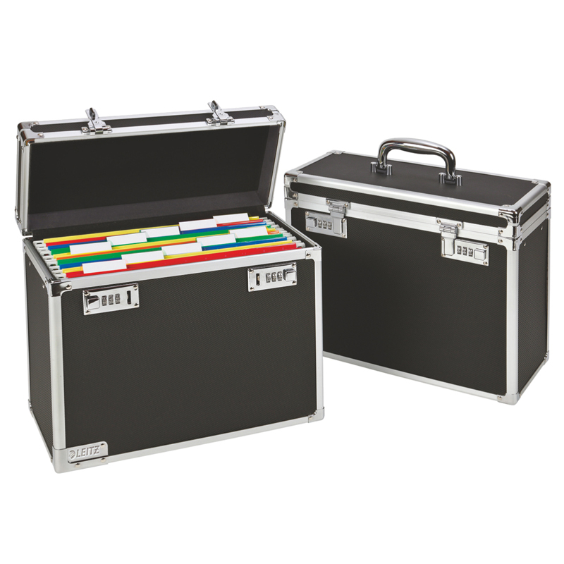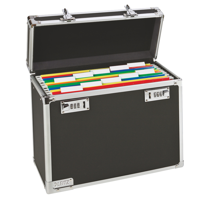 Pevný prenosný uzamykateľný archivačný box pre 20 závesných dosiek alebo 2 štandardné zoraďovače A4. Bezpečnosť dokumentov je zaistená dvojitými číselnými zámkami. Vhodný na prenos a archiváciu dôverných dokumentov v závesných doskách. Archivačný box je vyrobený zo silného plastu, boky má spevnené kovovými profilmi. Box je dodávaný s nastaviteľným popruhom na rameno. Vnútorné obaly nie sú súčasťou boxu. Na veku má kovové držadlo a na prednej strane štítok pre popis obsahu. Má gumené nožičky ktoré chránia nábytok pred poškodením. Váha 1,94 kg. Rozmery 366 x 310 x 165 (mm)