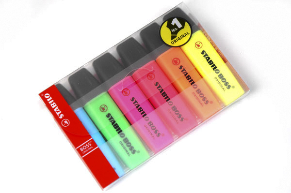 Rekordman a jednička na trhu medzi zvýrazňovačmi. Značková kvalita od samotného vynálezcu zvýrazňovača. Vďaka schopnosti vydržať dlho bez viečka je STABILO BOSS ORIGINAL ideálnym pomocníkom pre náročné čitanie a učenie. Vysoký výkon zvýraznenia stoviek metrov textu v rovnakej intenzite do poslendého centimetra. Náplň s fluorescentnou farbou na vodnej báze so špeciálnym hrotom. Stopa písania 2 - 5 mm. Väčšie balenie 10 ks v jednej farbe. - Farba: sada 6 ks zvýrazňovačov + pohár - Balenie: 1 ks