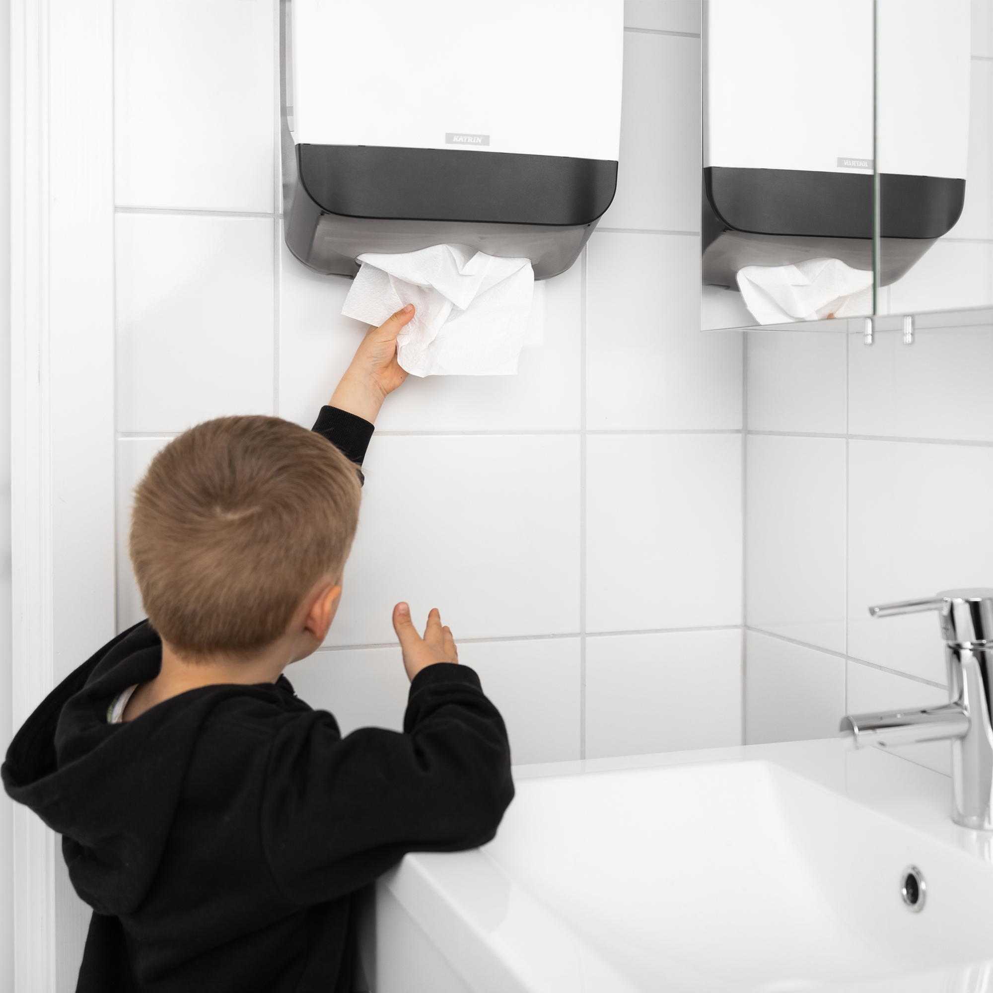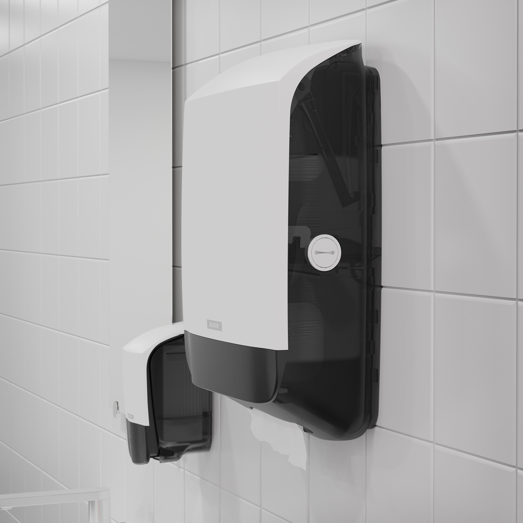 Plastový zásobník KATRIN na skladané ZZ utierky. Vyrobený z odolného ABS plastu. Kapacita 2,5 balíka. Univerzálny dávkovač papierových utierok funguje so všetkými typmi skladacích utierok C-Fold, Non Stop, One Stop a Zig Zag s maximálnou šírkou do 240 mm. Podporné rebrovanie udržuje balík utierok v dávkovači rovnomerne. Pre jednoduchšie naplňovanie kryt sa otvára smerom hore. Zámok je možné používať s kľúčom alebo bez kľúča.