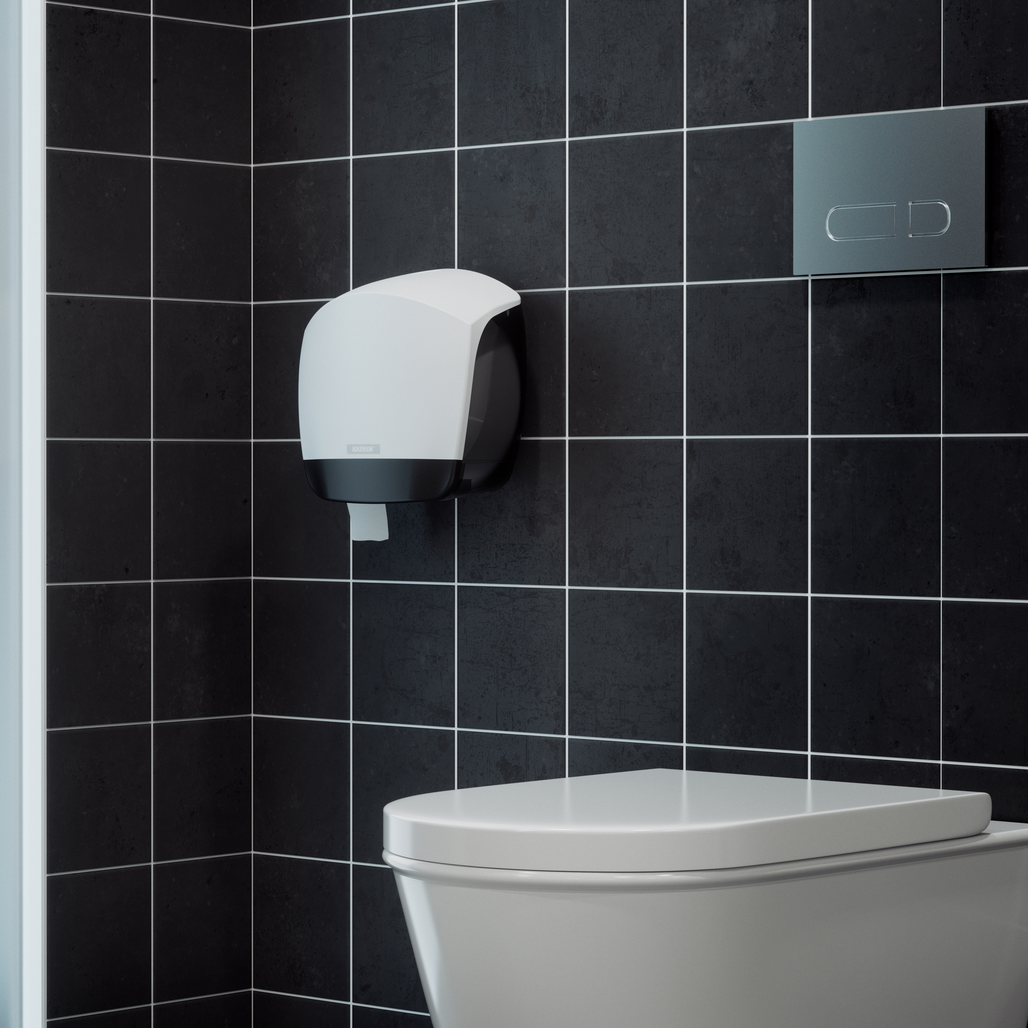 Zásobník toaletného papiera Katrin pre rolky až do 19 cm.