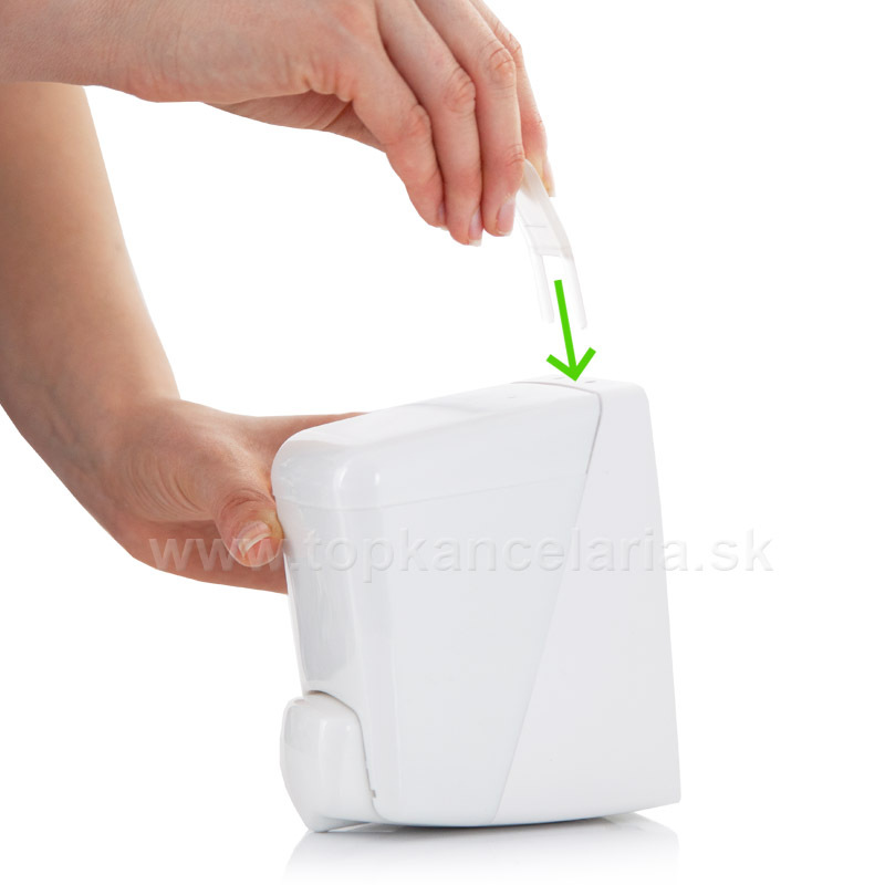 Menší dávkovač tekutého mydla s nádržou na dolievanie. Bol navrhnutý a prispôsobený k umývadlám menších rozmerov a do menej frekventovaných priestorov. Je vyrobený z bieleho odolného ABS plastu. Ľahké a rýchle doplnenie tekutého mydla. Stačí zasunúť univerzálny plastový kľúč (kľúč je rovnaký pre všetky modely), odstrániť horný kryt a naliať mydlo. Ľahká údržba a čistenie. Objem dávkovača 400ml. Rozmery 13,5x8,2x5,1cm. Kotviaci materiál 3x hmoždinka so skrutkami sú súčasťou balenia.Vyrobené v EU.