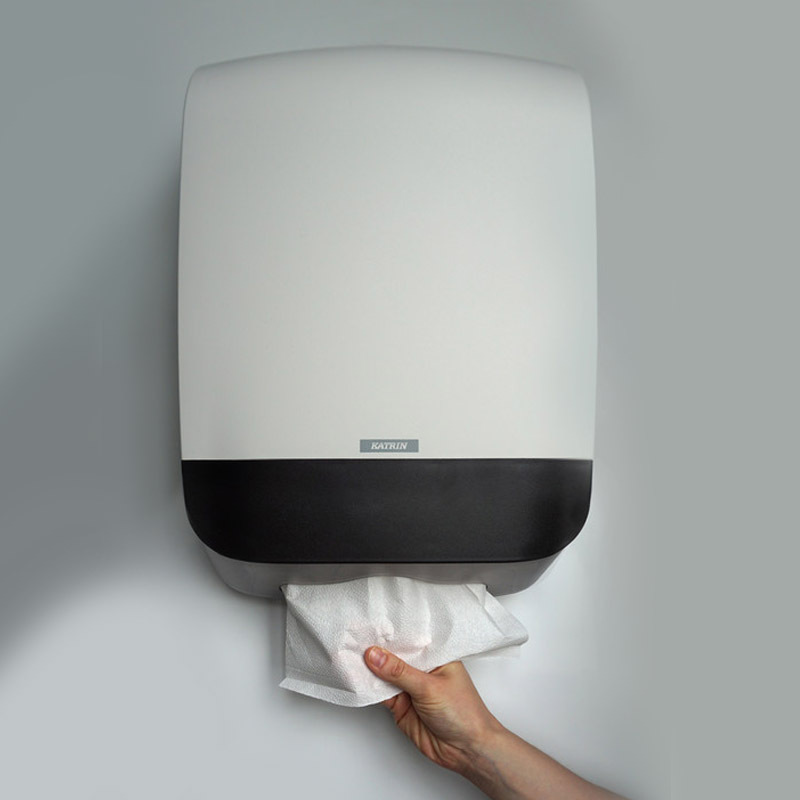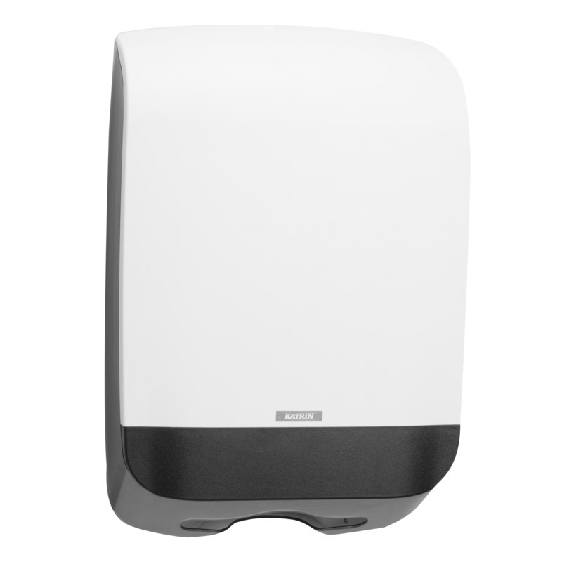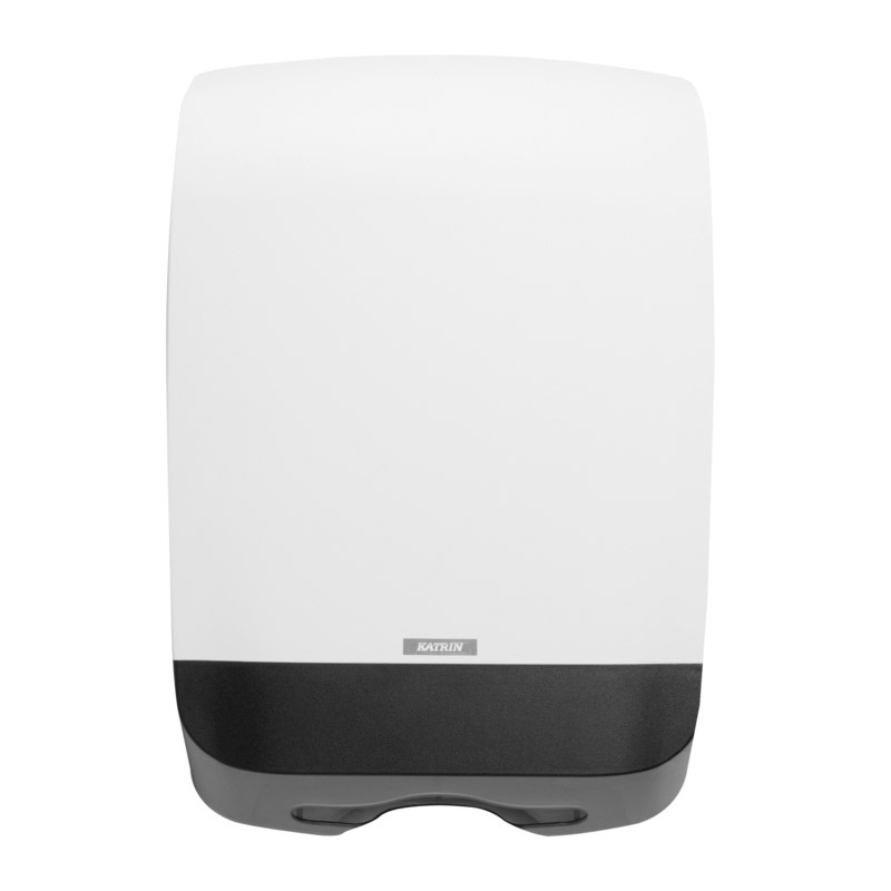 Plastový zásobník KATRIN na skladané ZZ utierky. Vyrobený z odolného ABS plastu. Kapacita 2,5 balíka. Univerzálny dávkovač papierových utierok funguje so všetkými typmi skladacích utierok C-Fold, Non Stop, One Stop a Zig Zag s maximálnou šírkou do 240 mm. Podporné rebrovanie udržuje balík utierok v dávkovači rovnomerne. Pre jednoduchšie naplňovanie kryt sa otvára smerom hore. Zámok je možné používať s kľúčom alebo bez kľúča.