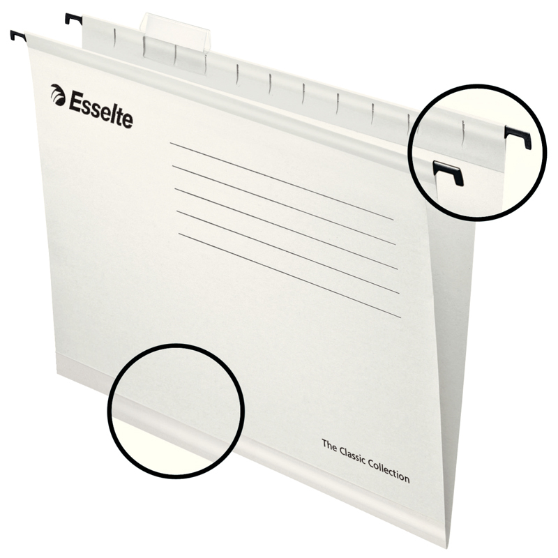 Závesné obaly A4 v rôznych farbách Esselte Classic sú vyrobené zo silného kartónu 205g/m2. Súčasťou obavou sú plastové rozlišovane s vymeniteľným papierovým štítkom. Rozlišovane je možné upevniť v 9 rôznych pozíciách. Lisované dno umožňuje zvýšiť kapacitu dosky až na 3 cm. Balenie obsahuje 5 ks kartónových prúžkov širokých 2 cm, ktoré po zasunutí do špeciálnych otvorov spevnia dno dosiek. Formát A4, rozpätie vodiacich líšt 330 mm. Cena za balenie 10ks.