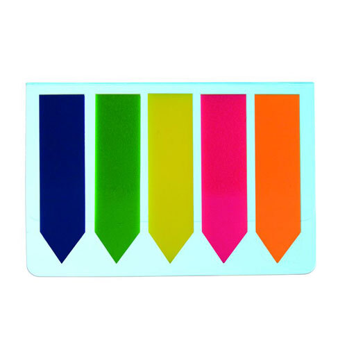Záložka v tvare šípky z farebnej transparentnej fólie v 5 neónových farbách. Záložky sú na čírom plastovom nosiči. Balenie 5x 25ks. Rozmer 12 x 45mm, rovné konce