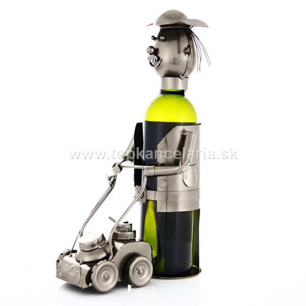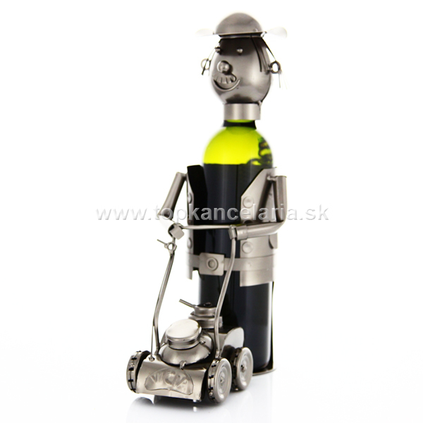 Ručne vyrábaný kreatívny stojan pre klasickú vínovú fľašu 0,75 s motívom záhradník s kosačkou. Originálny darček pre oslávenca, ktorý určite prekvapí aj hostí. Každý kus je originál. Lakovaná povrchová úprava v platinovej farbe.