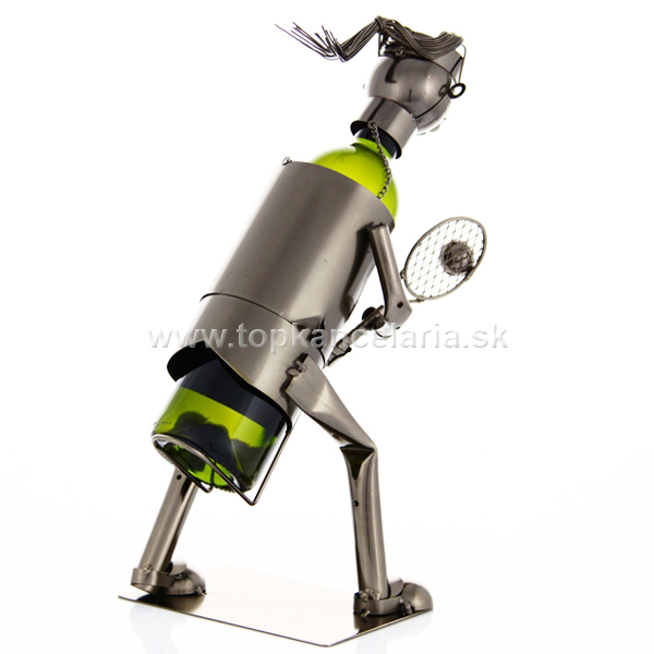 Ručne vyrábaný kreatívny stojan pre klasickú vínovú fľašu 0,75 s motívom tenistka. Originálny darček pre oslávenca, ktorý určite prekvapí aj hostí. Originálny darček pre oslávenca, ktorý určite prekvapí aj hostí. Každý kus je originál. Lakovaná povrchová úprava v platinovej farbe.