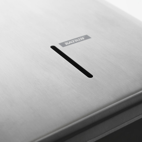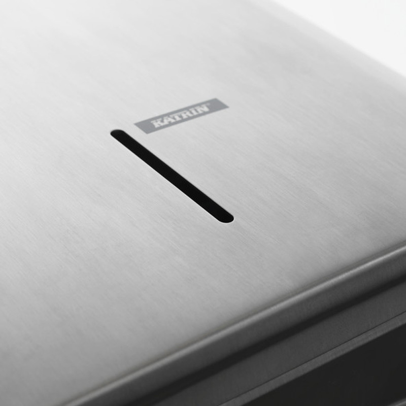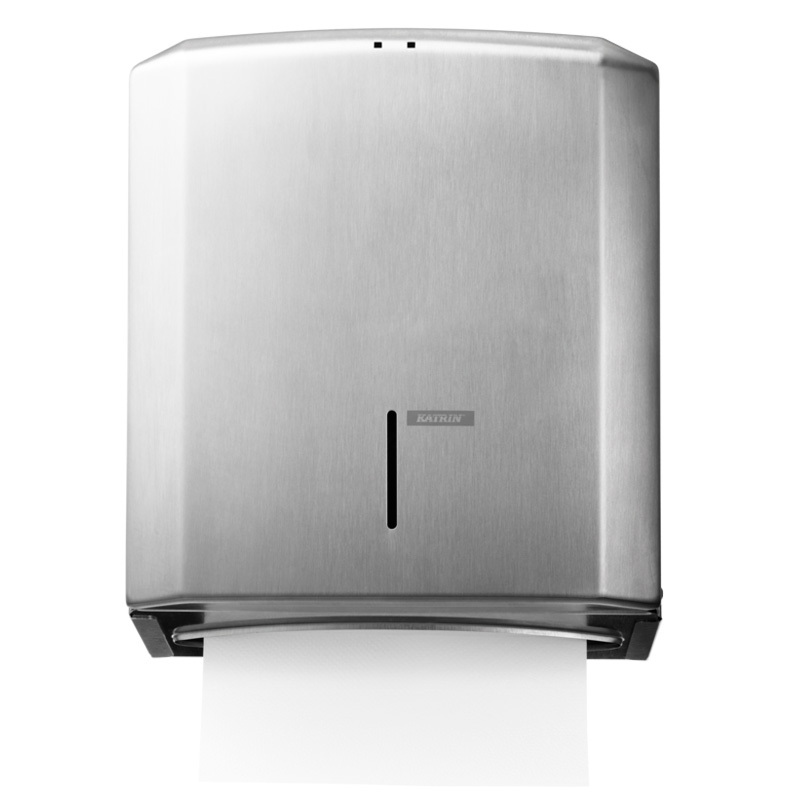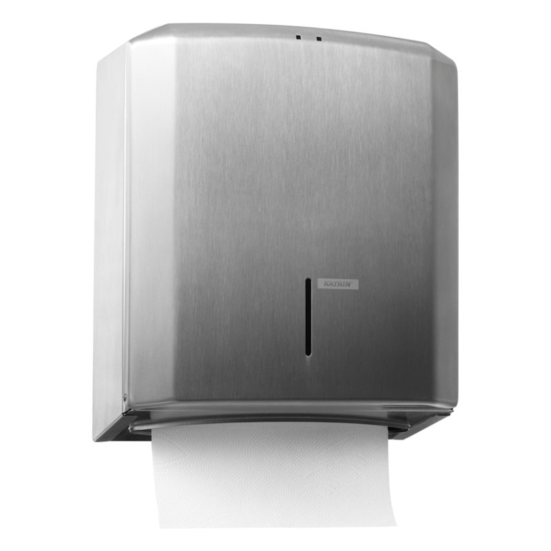 Plastový zásobník KATRIN na skladané ZZ utierky. Vyrobený z odolného ABS plastu. Kapacita 2,5 balíka. Univerzálny dávkovač papierových utierok funguje so všetkými typmi skladacích utierok C-Fold, Non Stop, One Stop a Zig Zag s maximálnou šírkou do 240 mm. Podporné rebrovanie udržuje balík utierok v dávkovači rovnomerne. Pre jednoduchšie naplňovanie kryt sa otvára smerom hore. Zámok je možné používať s kľúčom alebo bez kľúča.